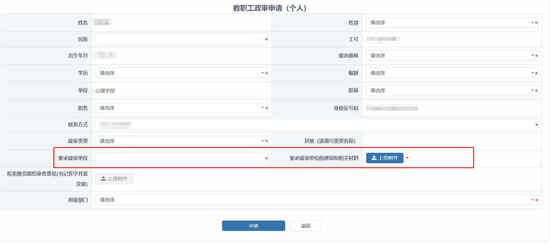 2、填报系统中要求的各项内容,完整上传要求政审单位的通知和相关说明材料,便于学部党委进行审核;