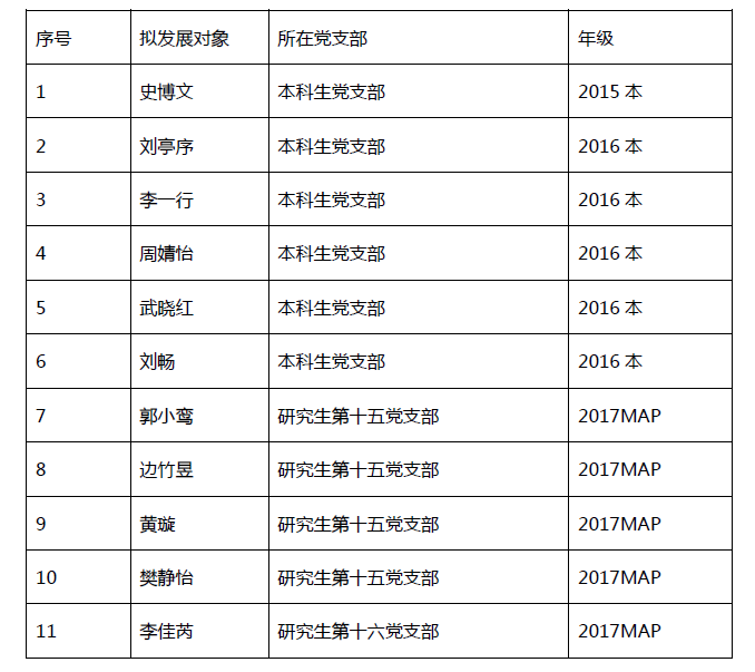 根据学校党员发展相关规定,金牌影院 党委于2018年3月23日召开了确定党员发展对象大会,评委们根据入党积极分子的答辩情况、日常表现进行综合评议,最终确定了2018年春季学期拟发展学生党员名单,现公示如下:(排名不分先后)