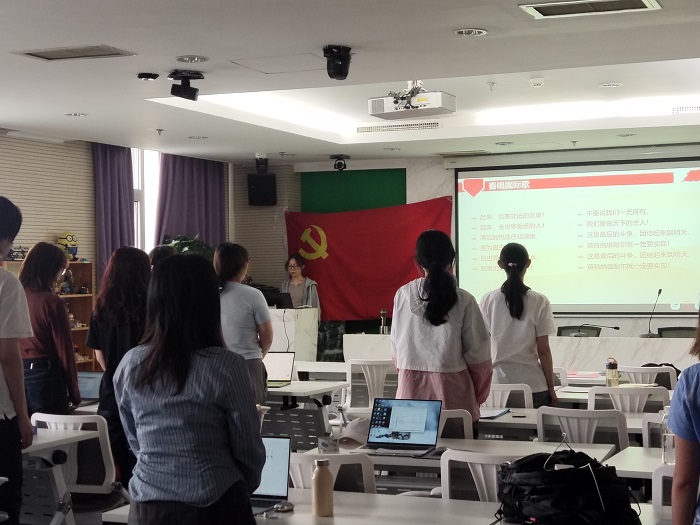 2023年5月20日下午17:00,金牌影院 本科生第一党支部在后主楼1318召开了2022-2023学年春季学期第一次发展大会。 首先,全体参会人员面向党旗起立,齐唱《国际歌》。随后,支部书记陈璐介绍发展大会流程。