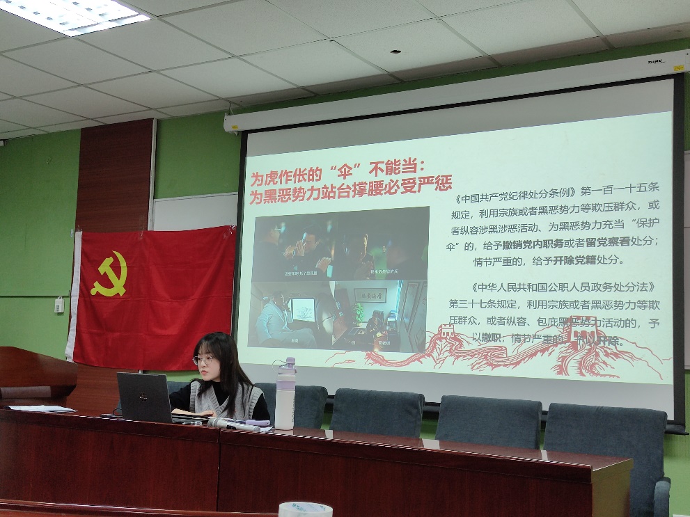 在分享了剧情和对应违反的法律法规后,孟玉洁同志介绍了《狂飙》电视剧的原型,带领大家了解曾发生在现实社会中的涉黑案,并提出扫黑除恶专项斗争的必要性和重要意义。