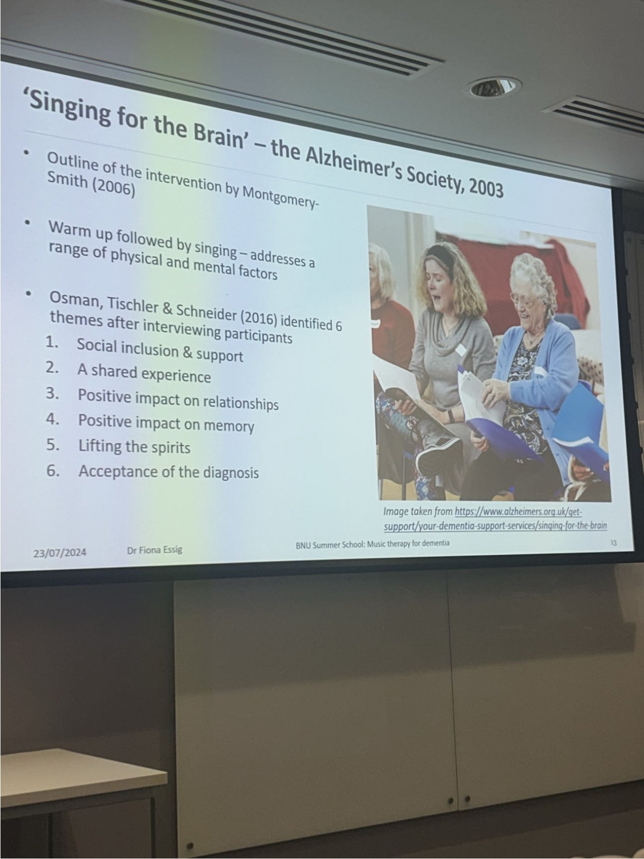 在第二周的周二到周四,Fiona Essig博士为我们讲授了最后一个主题的课程——艺术治疗与心理学。相较于前两个课程,这门课程更加偏向应用,也有更多需要我们静下来感受的部分。在这门课程中,我们得以触碰艺术和心理学交织的独特魅力。Fiona Essig博士的课堂分为教室内和教室外两部分。教室内,她带领我们从痴呆症、抑郁症等心理健康视角深入探讨了音乐在心理治疗中的奇妙运用,让我们了解什么是幽默,什么是黑色幽默,而微笑又如何对心理健康起作用,让我们认识了喜剧治疗,并介绍了创造力和心理健康之间的关系;而在教室外,Fiona Essig博士带领我们参观了Tate Modern Gallery,我们观看战争、色彩、图形等多种主题的艺术作品,并且从心理健康的角度去理解和感受它们。 第一节课大家围绕痴呆症的音乐治疗进行讨论。我们认识到音乐对痴呆症患者记忆保留和提取的功效,学习了最新的通过音乐疗法对痴呆症的干预方式及其好处。 在围绕抑郁症的讨论中,我们首先讨论总结了抑郁症的特征及传统治疗方法,随后学习了使用音乐进行抑郁症治疗的具体方式。Fiona以一项产后抑郁干预项目为例,为我们详细介绍了音乐疗法的有效性及运作模式。在该产后抑郁项目中,经过十周的合唱等干预,65%中度或重度抑郁的患者都已没有显著症状。我们还讨论了音乐对情绪的作用,如不同情绪下悲伤音乐的作用。