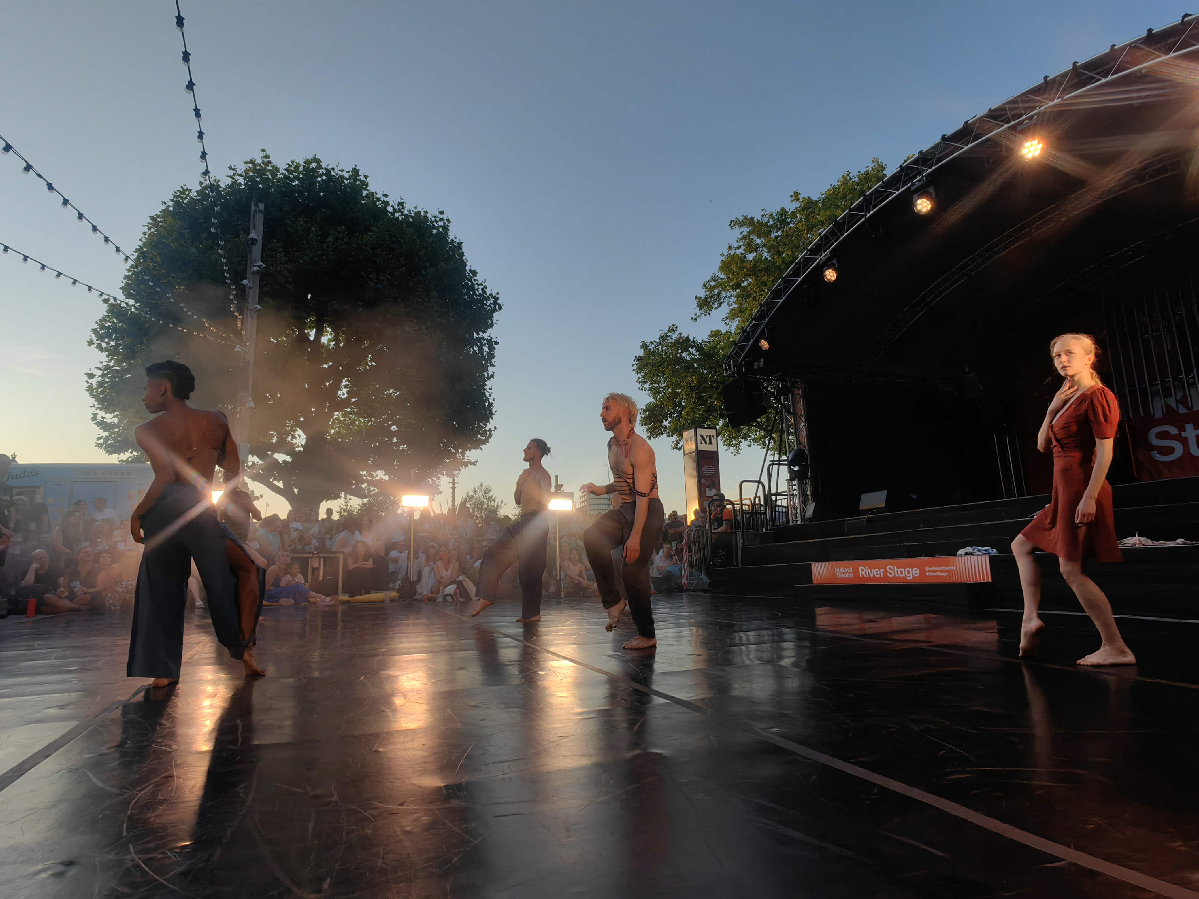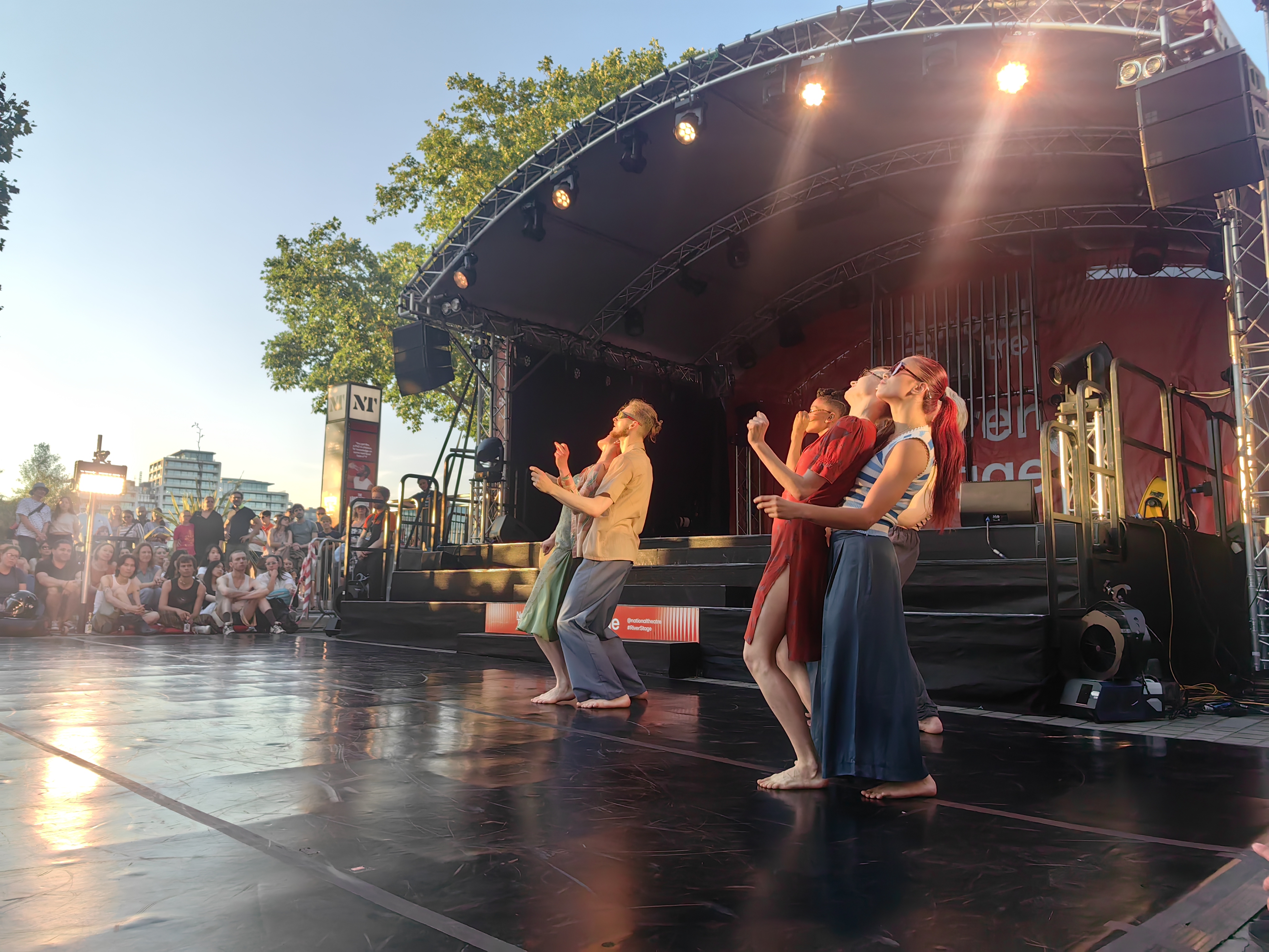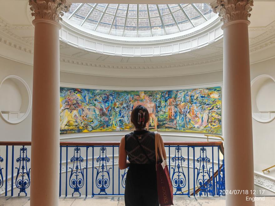 参加的另一个Social Programme是在一个傍晚去看National Theater的演出,我们到了后才惊讶地发现演出是露天的,舞台前面摆放了一排排的躺椅,仿佛置身海边,有很多伦敦本地人手握着一杯啤酒躺在躺椅上,享受着这样惬意而凉爽的时刻,由于躺椅都被占满了,于是我们在舞台的侧边找了个位置坐在地上,等待演出开始。音乐响起后,我看到了我人生中迄今为止最精彩的一场舞蹈演出。这场演出的表演来自英国国家剧场兰伯特舞团,一开始只是每个人自在地舒展着肢体,在蓝天下尽情地表达着自我,后来随着鼓点渐强,所有人又汇集到一起,整齐划一的动作充满了力量感,在夕阳金色的光下他们的皮肤闪闪发光,洋溢着无尽的生命感。这是我第一次如此之近地看一场舞蹈表演,他们扑面而来的生命感同时也感染着我,让我也有一种加入他们上去跳舞的冲动。夕阳、音乐、人群、舞蹈、艺术......这些美好的元素叠加在一起组成了一个久久难忘的黄昏。在表演结束后,我们也加入了当地的人群在舞池里舞动,一开始羞涩拘谨怕自己跳得不好,勇敢地加入他们一起跳舞之后这种感觉就慢慢地放下了,因为在这场活动中的每个人都很享受,没有人在意你跳得怎么样,每个人只是沉浸在音乐与快乐自由的氛围中,释放着自我......在这次活动中我们体验了一次当地居民日常松弛满满的生活,如果不是KCL给我们安排了如此丰富多彩的Social Programme,我们也看不到这种精彩的表演,体会不到如此好玩的活动,非常感恩学校的精心安排!
