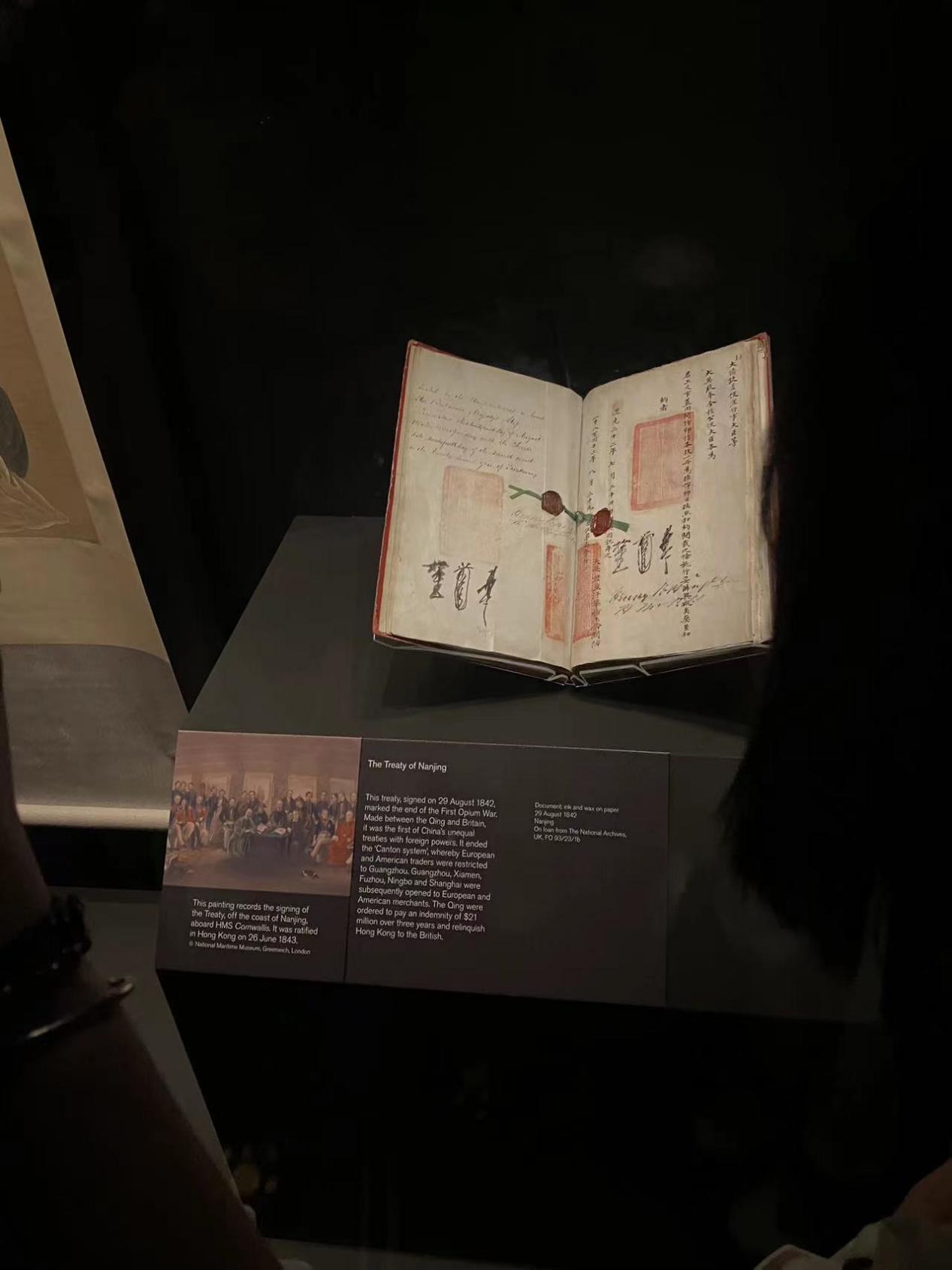 在大英博物馆的参观中,特别是晚清特展,给我留下了深刻的印象。那些珍宝、服饰、书画和工艺品仿佛在展示柜中重新焕发了生气,让我仿佛与历史真实亲密接触。其中最令我难以忘怀的是南京条约。即便是经历过无数次课本上的铭记,当我亲眼看到这份合同时,震撼之情依旧涌上心头。泛黄的纸张,褪色的字迹,似乎都在诉说着那段刻骨铭心的历史。复杂而深沉的签字,如同压在心头的重担,让我不由自主地停下脚步,凝视着那段过往。