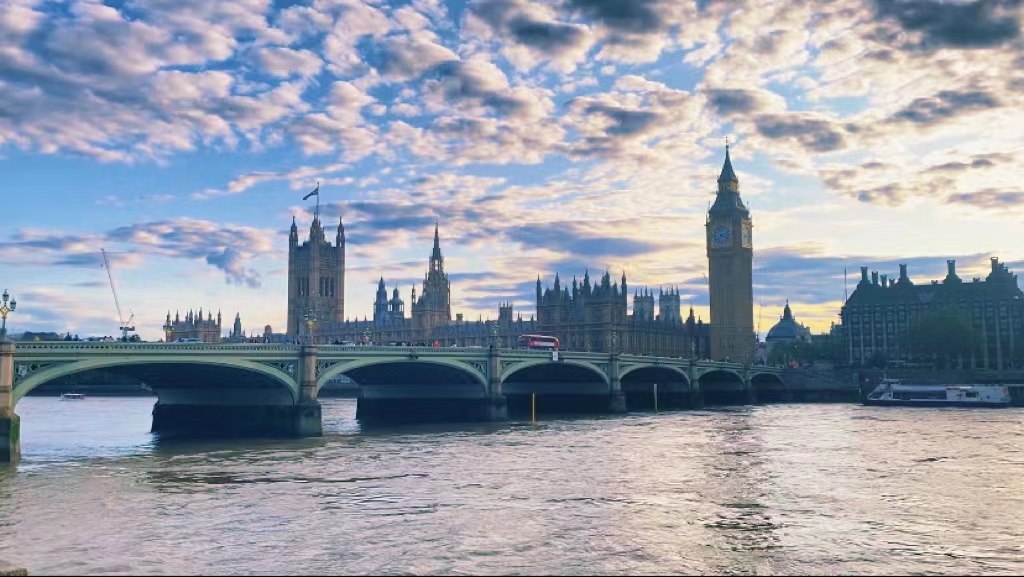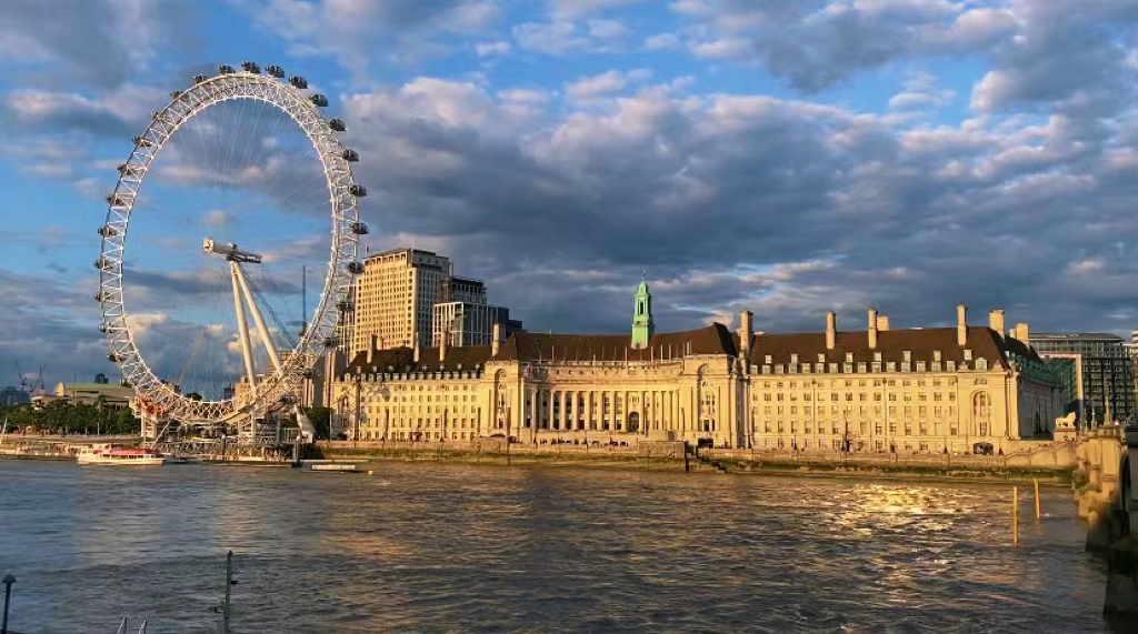 在伦敦的生活实在令人陶醉。我常常漫步在泰晤士河沿岸,感受着异国他乡的独特氛围。凉爽的晚风轻拂脸颊,夕阳的余晖映照下,波光粼粼的泰晤士河波浪荡漾,伦敦眼缓缓转动,而庄严肃穆的议会大厦旁,矗立着大本钟守护着时间。