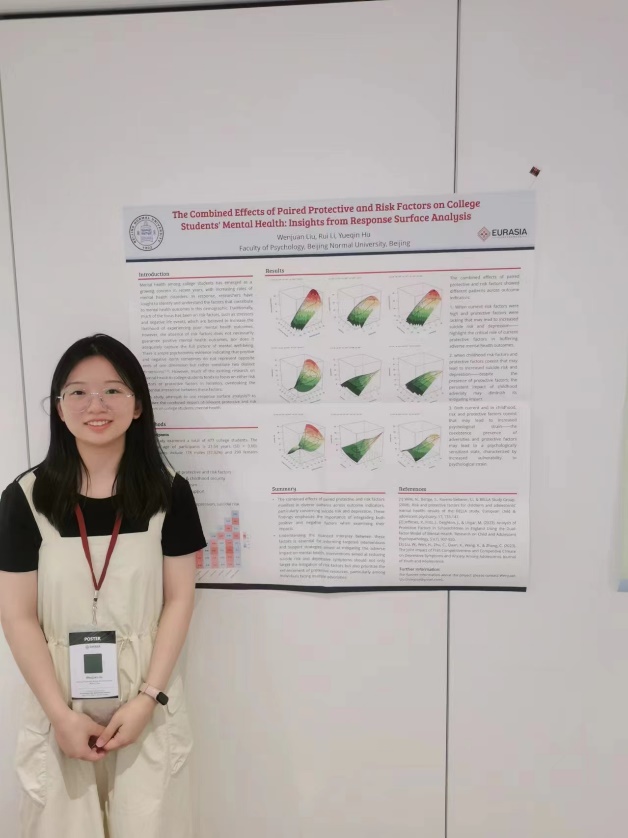会议上有几场报告令我印象深刻,有位研究者的报告探讨了自闭症儿童母亲的皮质醇水平变化及其与孩子睡眠质量的关联,强调了改善睡眠问题对减轻母亲压力的重要性。有研究者质疑了韦氏儿童智力量表第五版在评估天才儿童处理速度方面的准确性,并提出了改进建议。还有场报告介绍了成人韧性量表(ARS),讨论了如何评估和提升个体的韧性。通过聆听这些报告,我不仅深入了解了当前心理健康研究的前沿动态,也获取了许多实用的研究方法和干预策略,这些知识和经验对我今后的研究工作具有重要的参考价值。 这次参加国际会议通过与来自世界各地的学者交流,我深入了解了当前心理健康研究的前沿动态和发展趋势。这些交流不仅拓宽了我的研究视角,也让我了解了许多新的研究方法和工具。例如,我了解到如何利用大数据分析技术来进行心理健康研究,这对我的研究提供了新的思路。此外,我的研究成果在会议上得到了同行的认可和宝贵的反馈,特别是关于保护因素和风险因素对心理健康共同影响的研究方法和结果。这些反馈帮助我识别了研究中的潜在问题,并提出了改进的建议,为我今后的研究提供了宝贵的指导。 总体而言,此次国际会议之行是一次难忘且富有成果的学术旅程。通过这次机会,我不仅展示了自己的研究成果,获取了宝贵的学术反馈,还拓宽了国际视野,提升了个人能力。这些收获将为我今后的学术研究奠定坚实的基础。