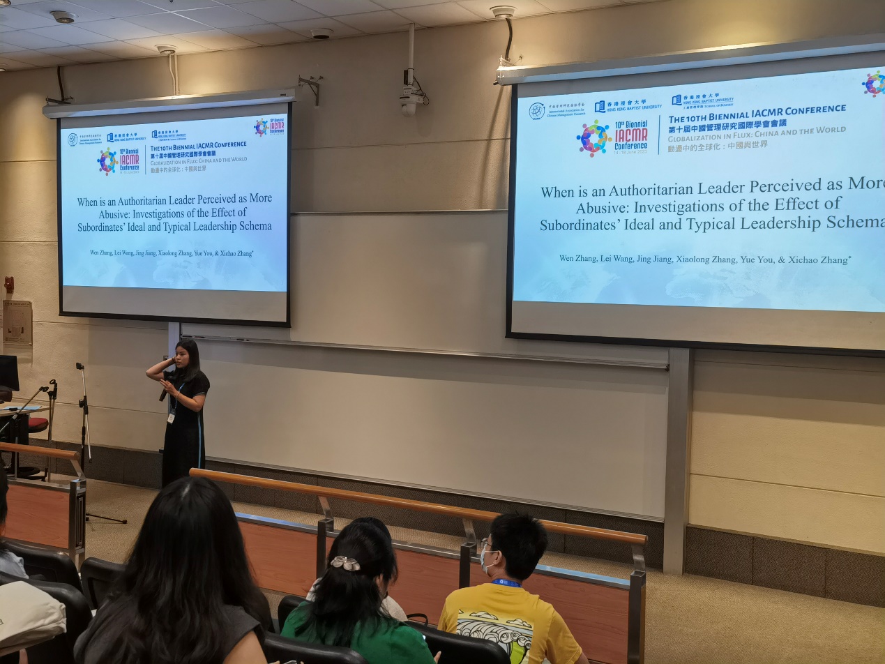 2023年6月19日中午,我们登上了长达八个半小时车程的高铁,困倦疲乏,但满载而归。看着逐渐远去的风景,回想起这几天新鲜而奇妙的经历,宛如从梦中醒来,美好尚留,记忆已经存档。 大约一个星期前的早晨,我和实验室的小伙伴们迎着北京炙热的阳光,从大兴国际机场启程,带着忐忑与未知,飞向了祖国的南边——香港。路上飞机时不时地颠簸让我悬着的心似乎更加紧张起来,就在不久后的几天,我将第一次面向国际友人用英文汇报我的文章。香港的天气潮湿闷热,对于一个纯正的北方人来讲实在有些难以适应,似乎每个毛孔都在努力地张开大口呼吸,汗水如雨唰唰地流下。一个多小时的大巴终于带着我们抵达了入榻的酒店。四人间果然如想象中逼仄,但团体的氛围感又削弱了心中的一些不安与陌生。第一次来香港,除了气候的巨大差异,人文风情也是百般不同。每当需要沟通交流的时候,自己内心总是忐忑的,英语一般,粤语甚至很难听懂。这里有很多山,路总是此起披伏,没有熟悉的共享单车,面对可能坐不明白的公交车,我们选择步行参加14号晚上的欢迎招待会。 香港浸会大学有三个校区,而由于我们只有目的地建筑楼的英文缩写,经过一番询问才最终找到注册地点。我清晰记得注册地楼下漂浮着的会议热气球以及展牌,南方的学校果然和我刻板印象一致,地方大,建筑物雄伟几分,从北师大来到这里,截然两种完全不同的感觉。注册地点在楼上三层的一个半开阔平台上,我们到的时候人已经熙熙攘攘,甚至连注册附赠的纪念品库存都已告罄。天气闷热,人来人往,精心穿着的旗袍很快被汗水打湿。距离IACMR上一次线下年会已经过去5年,而这也是我研究生生涯或者说整个学生生涯第一次参加线下学术会议。可能在场很多人也和我一样,大家满怀激动与期待,同时又热情高涨,整个场地热闹非凡,人声来往不绝。欢迎招待会没有像开幕式那么正式,各位学者依次粉墨登场,轻松活泼的介绍很快又让场子热了一个度,而这第一次碰面也打破了我对研究学者的固有成见,这种亲切而自由的氛围让我严肃的内心也一下子放松下来。 第二天早上是开幕式,今年的年会主题是“动荡中的全球化:中国与世界”。通过本届大会主席沈伟教授和当地筹备委员会主席黄旭教授的介绍,我逐渐了解到研究生生涯之前的大会历史和发展。在这之后,陈晓萍教授、赵志裕教授与张燕教授分别就全球化和中国角色的主题展开了精彩的演讲,这种面对面的大型讲座宛如在听一场学术界的奇妙音乐会。其中令我印象深刻的是陈晓萍教授的演讲,陈晓萍教授来自华盛顿大学福斯特商学院,她主要关注社会困境中的合作与竞争、团队合作与领导力、企业家精神、中国关系以及跨文化沟通与管理等研究主题。陈晓萍教授以“Did You Hear My Eye Roll? Cross-cultural Studies of Communication Style, Leadership Potential, and Employee Outcomes”为题,介绍了自己的研究团队,进而分享了有关沟通风格、领导潜力和员工成果的跨文化研究。研究表明虽然众所周知超过65%的含义是通过非语言线索而不是语言本身传达,但一个人的沟通风格——沟通直接性与间接性——如何影响他人对个人领导潜力的判断,以及领导者的沟通间接性如何影响员工的工作表现和工作创造力,都是重要但研究不足的研究问题。通过对中国和美国样本的对比,她的研究揭示了在文化日益多样化的工作场所中间接沟通的复杂功能。原来在电脑屏幕前看着一成不变的文字和现场听到研究者亲口讲述的感觉是如此的不同,每一个子研究、逻辑点都似乎代入了研究者思想的生命力,直直地钻入我的脑海,冲击着我的内心。当然,我的英语水平有限,只有一直全神贯注听讲才能跟得上。 上午的环节过去后,马上就要到第一场多会场报告了,而我的论文展示恰好被安排在了这个最早的时间段。作为第一次学术首秀,我真的十分紧张,感觉呼吸都在颤抖。我们的会场一共三个人报告,我被安排在了第二位。第一位是来自香港大学的学者,她流利的口语与自然的表达让我既羡慕,又感到自愧不如、羞耻不已。一分一秒,如坐针毡,然而时间也在悄悄流逝,很快就来到了我的环节。我鼓起勇气站上了讲台。我所报告的主题是威权型领导何时被认为在辱虐管理:下属典型和理想领导力图式的影响的调查。研究借鉴领导能力分类理论,旨在探讨领导能力风格和下属的分类如何影响下属对辱虐管理的感知这一问题。领导力分类理论认为,下属通过含蓄地将领导者与领导者的认知代表性属性进行比较,从而对领导者进行分类,即领导原型。当领导者与下属的积极原型相匹配时,对他们的评价会更高,反之亦然。我们认为,独裁领导,通过激活下属的领导负面原型(即反原型),引起下属对辱虐管理的感知。然而,原型是单独持有的,并且在不同的下属之间可能会有所不同。下属将现实中的领导者与他们的理想原型进行比较,然后将领导者分类为有效或无效。我们认为,拥有较高期望的下属觉得威权型领导更不宽容和消极,因此更容易感知到辱虐管理。我们的研究有助于提供一个更全面的视角,探索领导的行为和下属的理想和典型的领导图式如何相互作用,从而影响下属的辱虐管理的认知过程。经过台下数几十次的练习,我熟练地吐露出早已耳熟能详的流利口语,但是紧张的心情却让我没办法自然地和台下的观
