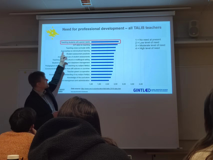 图5 特殊教育讲座课堂 按照学生人数,每个年级大约有1-2名特殊教育老师,为此,教师不仅需要了解全方面知识,更需要采取多样的课堂活动形式以适应学生的实际表现:如果学生在初步课程仍然跟不上进度,那么需要考虑继续增加课时;反之,如果学生的学业进步到不需要额外补习的水平时,特殊教育课程则会适时终止。然而,这也不意味着水平较高的学生的能力无法得到施展;我们在图尔库大学时,教授告诉我们,各个年龄段的学生可以根据自身兴趣选择夏令营,大学会尽可能活用学校内部的资源满足他们对知识的需求。赫大校园中的化学实验室Gadolin就是面向全国学校开放的实验室,只要日程安排合适,就可以预约前往参观学习。对不同学段的学生或是儿童,教授们会根据时间安排选择与校内知识接轨的实验,让学生感受到化学平易近人、融入生活方方面面的魅力。此外,带领我们动手操作肥皂泡实验的Reija Pesonen教授强调,再简单的实验、也可以根据学生的实际水平进行扩展。如果是小学生,那么只需要问到生活中干冰的应用就行;如果是初中生,也许就要回答物质状态转化,宏观物理的知识;如果是对化学非常感兴趣的高中生,就可以提到化学键成因、气体内部原子构成的问题。从生活中稀松平常的现象由浅入深,适时抛出问题引发思考,再在超出能力范围的困难面前点到为止留下好奇心和悬念......这不仅需要对领域知识了解充分,对学生群体的能力也要精准把握才行。