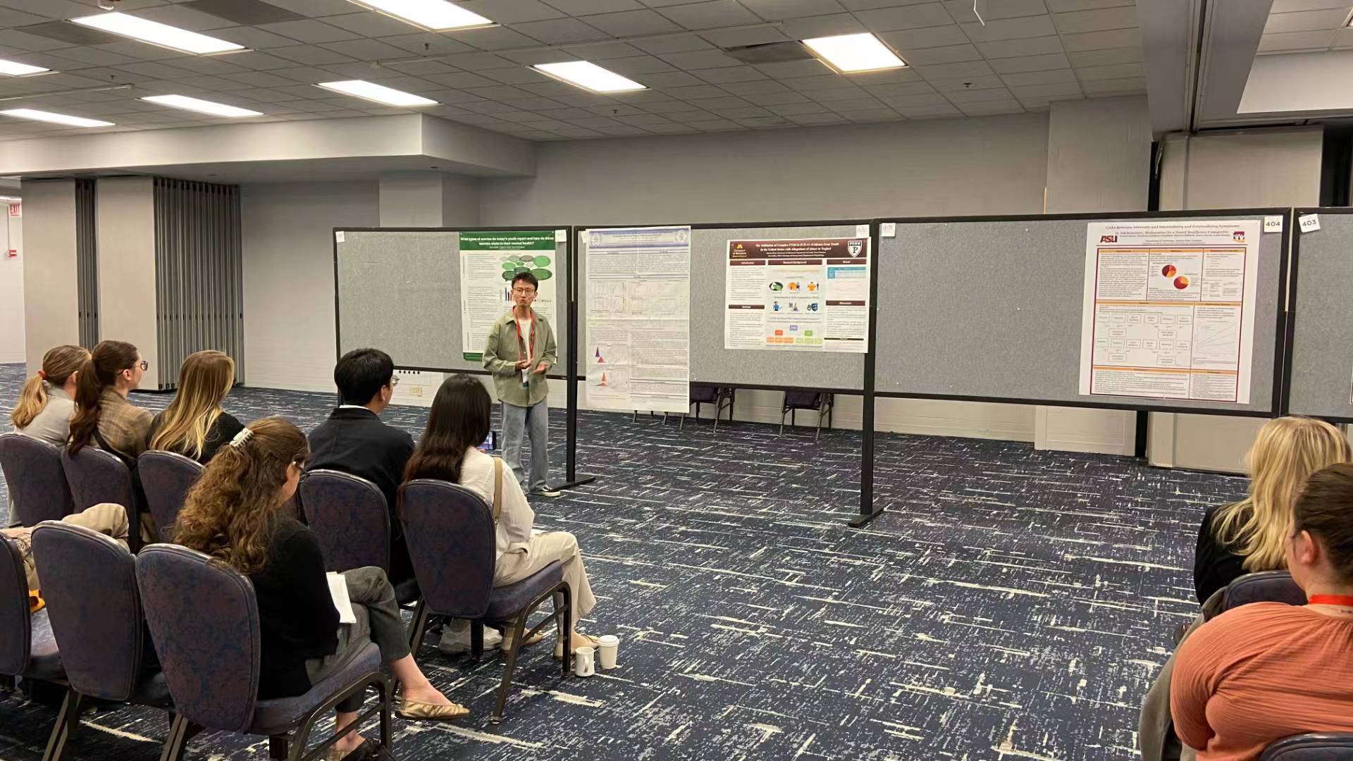 这次远赴美国参加青少年研究学会(Society for Research on Adolescence),获益颇丰。主要体现在以下几个方面:首先是学术收获方面。在参会的一年以前,我才开始转向儿童与青少年心理健康领域,相比于一起去参会的同学部的小伙伴而言,我还是个萌新。在这次的会议中,我看到了更加丰富的研究呈现形式。以往国内学术会议的海报展贴,只有一种形式,即将海报贴在展板上,研究者站在旁边等待别人提问。而国际性的学术会议海报除了单纯的展贴之外,还有2分钟和5分钟的演讲形式。研究者针对自己的研究内容演讲完再等待现场观众提问。一开始,我是不知道我的摘要需要进行5分钟的口头汇报,当知道要面对一群外国人要进行英文汇报时,我还是比较焦虑和紧张。还好后面花时间进行练习后,最终较为顺利和流畅地完成了汇报。在汇报结束后,也有观众进行了提问。这个过程中也出现了较尴尬的场面。观众用英文进行了提问,但是说的比较快,我一时没有听懂,导致最后没有正面回答别人的问题。令人欣慰的是,后面有很多中国留学生对我们的工作产生了很大的兴趣,我与他们一直交流到上午场的会议结束。在这个过程中,也认识了很多来自各所高校的新朋友,在吃饭时,彼此也有了更深的了解。我也对中西方在读博士生的现状差异有了初步感受。 在文化体验方面,我感受到在国际学术会议上,研究者们彼此交流的热情极大。在海报展贴时,当你走过他们面前,不敢轻易与他们进行对视。一旦视线接触,他们就会热情地询问你是否有问题和想要了解他们的研究。就我个人而言,在以往国内的学术会议中,我很少看到如此热烈的海报展贴现场。在听口头报告时,有不少令我震撼的现象,其一是一位博士生妈妈抱着她的孩子在进行汇报,她的孩子可能还不到一岁。汇报时,她的孩子转向海报,静静地聆听她妈妈的研究。这一幕令我非常感动。其二是一位老师帮她已经毕业的硕士生来进行海报的讲解。这与国内也有些许不同。其三是在海报展贴现场能够看到各种不同肤色,不同年龄段的人们。在国内的学术会议的展贴板块,还是不太容易看到年级较大的研究者或者老师的身影。这是一点也是我所观察到的重要的差异。 海报展贴现场,我也主动地去询问了好几位外国研究者,其中包括一位本科生。虽然她做的研究比较简单,但是她有足够的勇气和自信站到国际会议上去向他人展示,能够从容地去向观众解答。这一点非常值得我去学习。这或许也是中西方不同文化影响下人们的心态和行为的不同。 总之,参加这次SRA 2024 Meeting拓宽了我的研究视野,了解到还有这么多的研究者在做很多有意思的研究。这次会议的高强度social让我直观体验到与不同国际同行交流的快乐,也收获了一波潜在的,未来可以互相交流学习的小伙伴,是一次值得不断回味的经历。