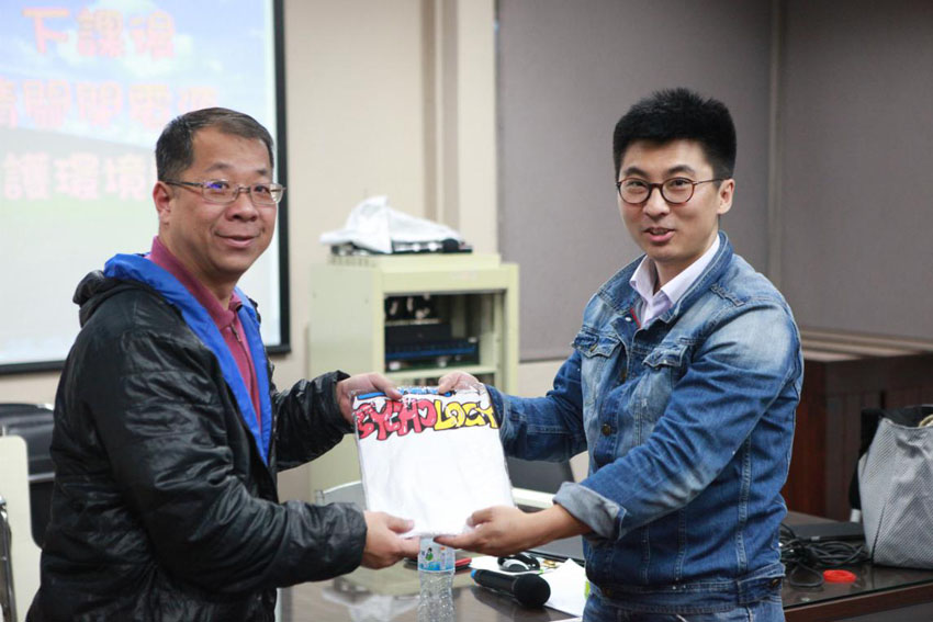 北师大心理学院2016MAP台湾实践行戴铮然同学为彰化师范大学学生代表赠送北师大心理学院文化衫