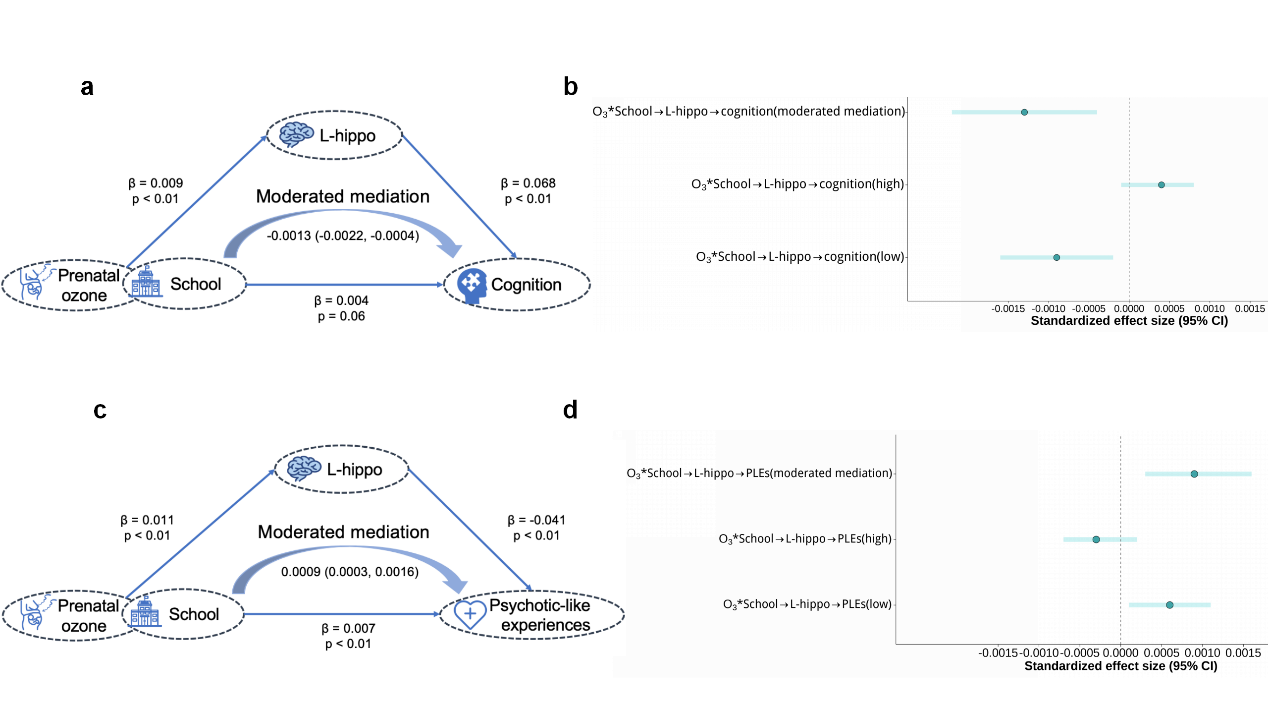 图1. 孕期臭氧暴露与学校/社区环境对边缘系统发育的交互作用 研究进一步发现,学校环境在"孕期臭氧暴露→左侧海马体发育→认知/精神病样体验"中介路径中发挥显著调节作用(见图2):在不利的学校环境下,孕期臭氧暴露通过降低青少年左侧海马体发育增幅,进一步降低认知功能和增加精神病样体验;而在良好的学校环境中,中介效应不显著,这凸显出支持性的学校环境具有一定的保护作用。 社区安全虽然显著调节孕期臭氧暴露与右侧杏仁核发育之间的关系,但对青少年认知功能及精神病样体验的间接效应均不显著(见图2)。当前效应未达显著性可能与随访时间较短有关,未来的研究应进一步探讨臭氧污染与社区环境跨生命周期的长期影响及其潜在神经机制。