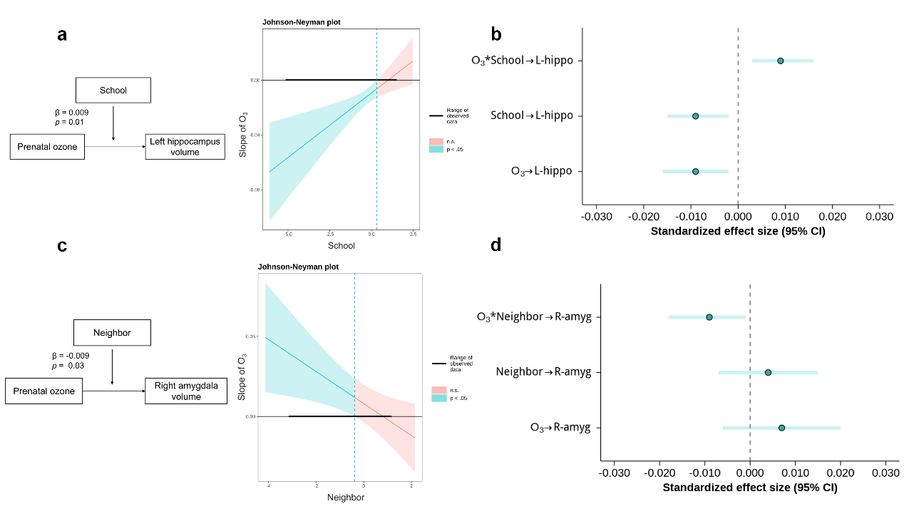 儿童长期暴露于物理环境(如空气污染)与社会环境(如不利家庭、学校及社区)的多重风险因素中,这些因素对儿童大脑发育和行为有显著影响。孕期是个体神经发育的关键敏感期,此时期的臭氧暴露可能干扰胎儿大脑发育,其神经毒性效应具有跨生命周期的持续性影响。学校与社区环境作为学龄儿童发展的关键社会生态微系统,对大脑发育和心理健康、认知均有重要影响。 环境风险因素并非孤立存在。然而,现有研究多局限于单一环境因素的独立效应分析,难以揭示多重环境暴露的协同作用机制。针对这一问题,金牌影院 金牌影院 罗良和刘然课题组深入解析孕期臭氧暴露与学校/社区环境对青少年边缘系统发育、认知能力和精神病样体验的协同效应及神经机制。 研究纳入6778名青少年,数据涵盖孕期、基线(9-10岁)和第2年随访(11-13岁)三个时间点。通过构建调节模型,检验孕期臭氧暴露与学校/社区环境对青少年杏仁核和海马体体积的交互作用。在此基础上,采用有调节的中介模型揭示杏仁核和海马体体积变化在多重环境暴露与精神病样体验/认知功能间的中介机制。 研究发现,青少年双侧杏仁核与海马体体积在两年随访期内呈现显著增长趋势,其发育进程受孕期臭氧暴露与社会环境的协同影响(见图1)。具体而言,学校环境显著调节孕期臭氧暴露对海马体发育的影响:在不利学校环境下,孕期臭氧暴露水平升高与青少年左侧海马体积增幅下降呈显著相关;而该效应在有利的学校环境中不显著。同时,社区环境显著调节孕期臭氧暴露对杏仁核发育的影响:当处于不安全的社区中,孕期臭氧暴露水平升高与青少年右侧杏仁核体积的增幅增大显著相关;而当处于安全社区中,该效应不显著。结果表明,多重环境因素共同塑造青少年边缘系统发育。