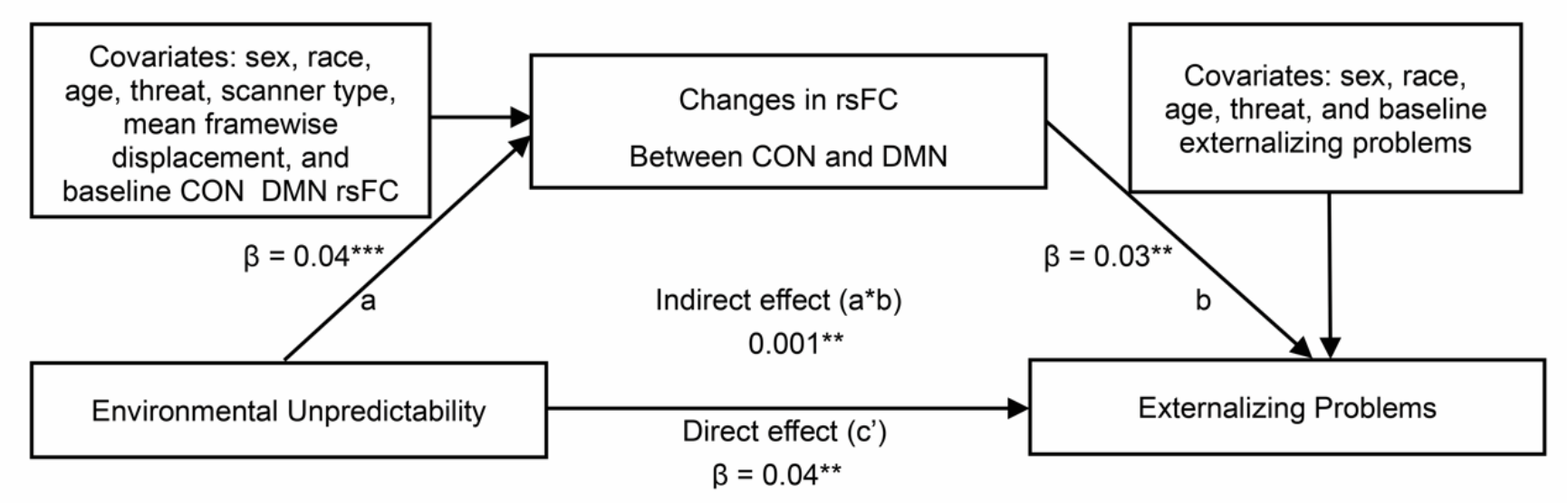 研究纳入了ABCD研究中的5885名青少年,数据涵盖基线(平均年龄119.13个月)到第3年随访四个时间点。研究通过稳健聚类标准误的方法考虑了数据中站点等嵌套结构的影响,并控制威胁维度和基线的静息态功能连接(resting-state functional connectivity; rsFC)数据,考察不可预测性、社区剥夺、大脑功能网络(默认模式网络(DMN)、扣带盖网络(CON)、额-顶叶网络(FPN))rsFC变化,以及青少年内外化问题多变量之间的复杂关联。 结果发现,不可预测性与DMN内部rsFC的增强幅度变小有关,与CON-DMN之间的rsFC减弱幅度变小有关。社区教育剥夺显著调节了不可预测性与DMN内部、FPN内部,以及CON-DMN之间rsFC变化之间的关系。CON-DMN之间rsFC的减弱幅度变小在不可预测性与青少年外化问题之间起到了中介作用。教育剥夺进一步加剧了这一间接路径的影响。