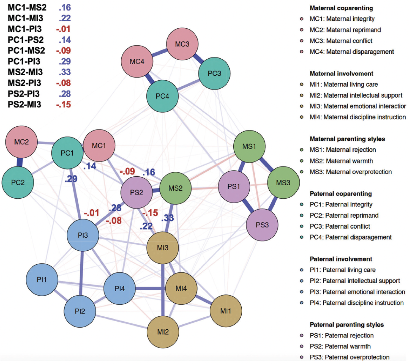 该研究通过对全国13个省市自治区37所中小学4852名生活于双亲家庭的青少年进行抽样调查,采用网络分析的方法探索了父母协同教养(例如,一致、冲突)、教养风格(例如,拒绝、温暖)和教养投入(例如,情感支持、规则教导)之间的关系。研究结果显示,父母支持性的协同教养、温暖的教养风格和情感投入是教养网络的核心成分。此外,这些特征在不同发展阶段的青少年中有所不同——母亲的支持性、温暖和情感投入在整个青春期都非常重要,而父亲的支持性、温暖和情感投入在青春期早期尤为关键。总体而言,与情感相关的养育行为可能是提升家庭教养系统的核心目标。