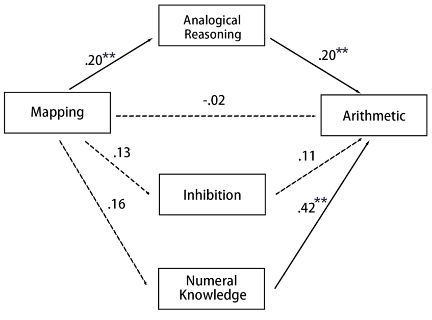 正文: 近期,金牌影院 金牌影院 杨秀杰副教授课题组发表了一篇题为“The longitudinal contribution of mapping to arithmetic: Do numeral knowledge, inhibition, or analogical reasoning matter?”的文章,探究了儿童早期的映射能力对于早期数学能力的可能的影响机制。该研究发表于教育心理学领域知名期刊British Journal of Educational Psychology上。 映射能力(mapping ability)是指儿童可以将数量转化为数字,并口头表达出来的能力,表明儿童能够使用数学语言表达数量概念(Mundy & Gilmore, 2009),比如,孩子最初能够从一数到十,但并不明白数字背后代表的数量概念,慢慢地孩子将数字和数量对应起来。该能力通常使用圆点数量估计任务测量(dot estimation)。近来不少研究发现儿童早期的映射能力对数学能力的发展有重要影响,但影响的机制尚不清楚。 以往研究发现儿童的执行控制能力(inhibition)、数字知识(numeral knowledge)、类比推理能力(analogical reasoning)都能够显著预测儿童早期的数学能力。同时,部分研究也发现了这三种能力和儿童映射能力的关系。比如,Purpura 等(2013) 发现数字知识显著中介非正式数学学习(例如,圆点数量估计)和正式数学能力;Gilmore 等(2013)的研究表明数量估计任务中的执行控制成分可能在数量估计能力和数学能力之间起到中介作用;而儿童在完成数量估计任务时,可能会在头脑中将眼前的数量和前一个任务中呈现的数量进行类比推理,从而估算出当下任务中的数量。因此,数字知识、执行控制能力及类比推理能力是否在儿童早期的映射能力和数学能力的关系中起到中介作用仍需要进一步研究。 我们邀请了118位幼儿园儿童(60名女孩)参与研究,每隔6个月进行一次测量,共3次。研究者第一次测量了儿童的映射能力、非言语智力,第二次测量了儿童的数字知识、执行控制能力和类比推理能力,第三次测量了儿童的数学能力。结果表明在控制了儿童的年龄、智力和性别后,儿童的映射能力仍可以显著预测儿童的数学能力。相对执行控制能力和数字知识,类比推理能力可能在映射与数学能力的关系中发挥了重要作用。