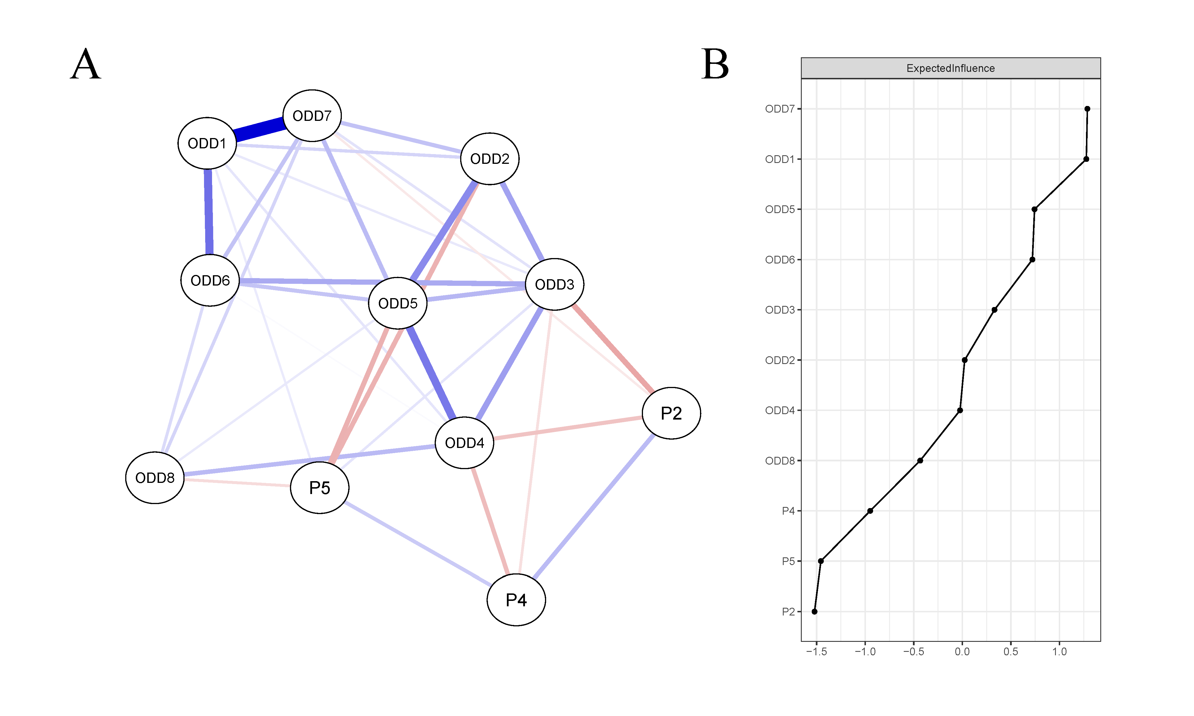 (A) INS模式和ODD症状网络。(B)网络中所有节点的预期影响中心性。 参考文献: Zhang, W., He, T., Zhou, N., Duan, L., Chi, P., & Lin, X. (2024). Children’s oppositional defiant disorder symptoms and neural synchrony in mother-child interactions: An fNIRS study. NeuroImage, 297, 120736. //doi.org/10.1016/j.neuroimage.2024.120736 |