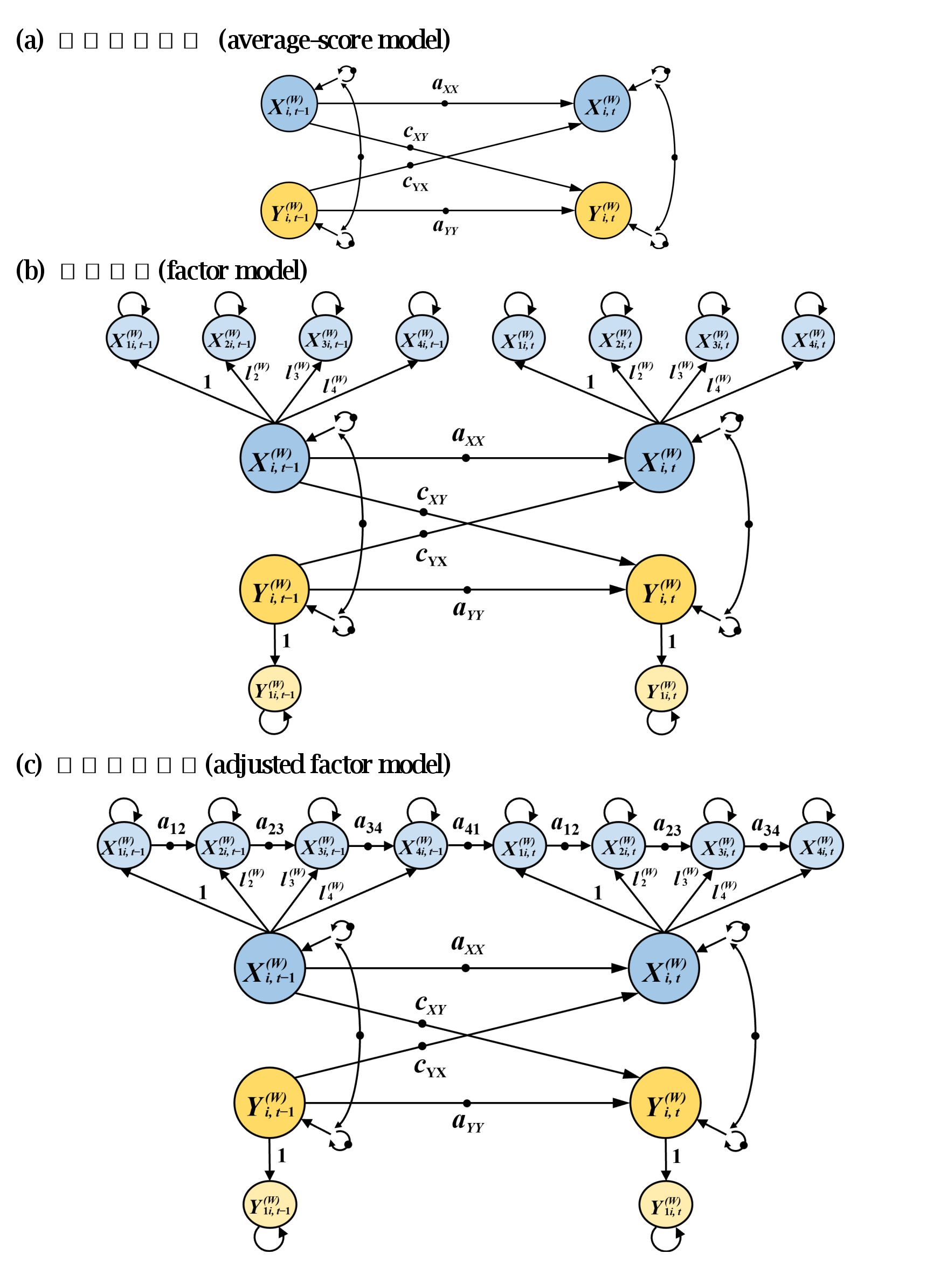 聚焦于稀疏时间尺度,以往研究采用平均分数模型(average-score model; 见图3a),取密集尺度变量的阶段均值(如,日均值)以匹配稀疏尺度变量,但损失了密集尺度变量的动态波动信息,且无法探究不同时间点的贡献差异。本研究首先提出因子模型(factor model; 见图3b),通过潜在因子整合密集尺度变量的多个时间点信息。研究还提出调整因子模型(adjusted factor model; 见图3c),在因子模型基础上进一步考虑密集尺度变量多个时间点之间的时序依赖,以更准确地考察变量间双向关系的整体效应,帮助回答变量间动态双向关系中“谁为主导”等关键问题。