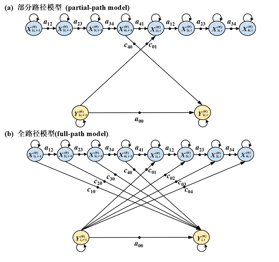 聚焦于密集时间尺度,以往研究采用部分路径模型(partial-path model; 见图2a),仅分析变量邻近时间点的滞后关联,但忽略了其他时间点的潜在相互作用。本研究提出全路径模型(full-path model; 见图2b),综合建模密集尺度变量所有时间点与稀疏尺度变量的动态交互效应,以更精确地考察变量间动态交互的具体过程,捕捉特定时间点的滞后效应。