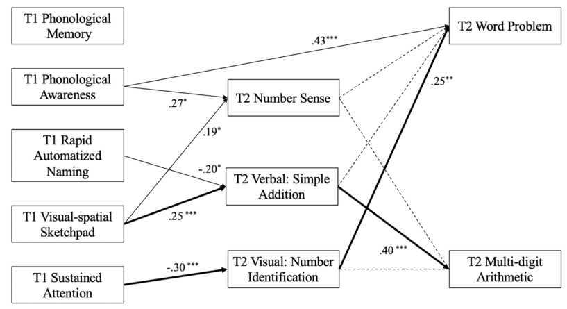 近期,金牌影院 金牌影院 杨秀杰副教授课题组发表了名为“Phonological processing and spatial attention contribute to mathematics performance in different ways: A 3-year longitudinal study”的研究。该研究发表在中科院大类一区教育学TOP和PSYCHOLOGY, DEVELOPMENTAL方向TOP期刊Early Childhood Research Quarterly上(5-year IF=5.1)。 数学技能的一些子成分,例如算术计算与复杂单词问题的学习对于后期的职业发展与学业成功至关重要。而一些一般领域的认知技能,例如空间注意与语音加工被认为与儿童的数学表现相关。但两种技能影响数学技能发展的机制尚不清楚,因此本纵向研究旨在考察中国儿童语音加工技能和空间注意能力对于数学表现的贡献。 研究共有184名儿童参加了4年的追踪测试,其中男生106名(平均年龄8.87 ± 0.37岁)。对于这些儿童首先使用联合瑞文测验测试非言语智力,之后分别测试了语音加工的三个子成分:语音意识,语音记忆与快速命名,使用视觉空间画板测量视觉空间注意,使用持续性表现任务测量持续性注意。此外还进行了非符号比较任务,简单加法任务,数字识别任务,复杂单词任务与多位数计算。整个测试流程分为两个阶段,分别是幼儿园与小学三年级,不同阶段的任务测试顺序随机打乱。 结果发现,在语音加工成分中,只有第一阶段的语音意识对第二阶段的复杂单词任务有贡献。此外,第二阶段的数字加工成分完全中介了第一阶段的空间注意了与第二阶段的数学表现。具体来说,第二阶段的简单加法中介了第一阶段的视觉空间注意与第二阶段的算术运算;第二阶段的数字识别中介了第一阶段的持续性注意与第二阶段的复杂单词任务。