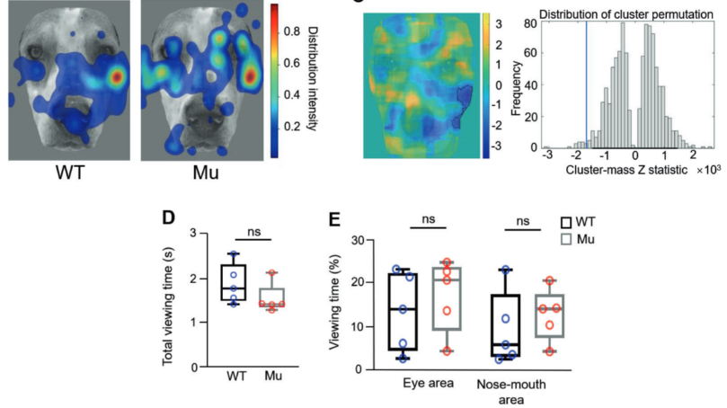 该研究还进一步探讨了Shank3突变犬减少眼部注视的潜在机制。研究团队采用“凝视引导范式” (gaze cueing paradigm)分析了犬对眼睛区域的注意力转移情况,发现突变犬更快地将目光从眼睛区域移开,而将目光转向眼睛区域的能力与野生型犬无显著差异,表明Shank3突变犬的眼睛回避行为是主动的,而非被动忽略。 有趣的是,Shank3突变犬在观看同类面部时,并未表现出与人脸相同的注意力减少现象。这一发现可能是因为犬类的社交信息主要通过身体姿态和尾巴动作传递,而非通过眼神交流获取。这一结果也提示了犬类在3.2万年的驯化过程中,与人类形成了独特的共进化关系,使其具备了高效解读人脸信息的能力,以更好地适应人类社会。