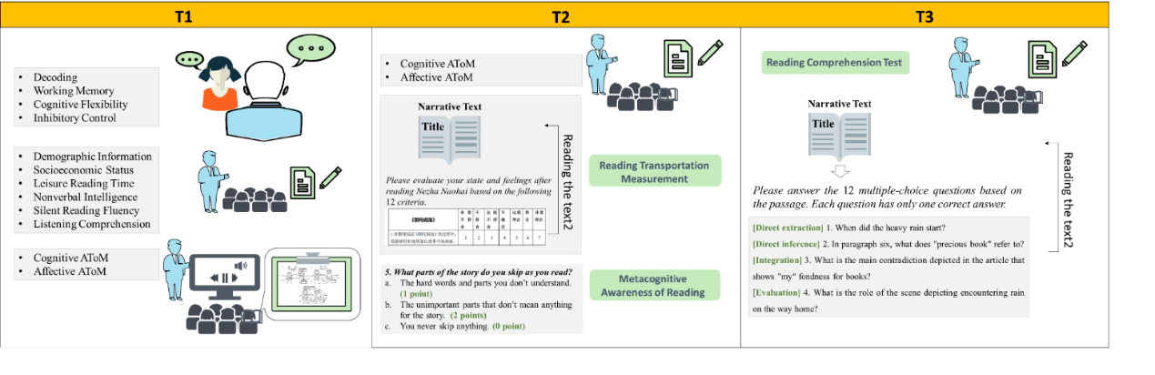 日常阅读中,许多儿童虽能流畅识别文字,却常常难以真正“走进”故事世界,理解人物的内心与复杂情感。这种表层流畅与深层理解的落差,引发了阅读研究领域对儿童“读心”能力的广泛关注。儿童如何穿透文本表层,理解角色或作者的意图与情感?背后的认知机制如何随年龄发展而变化? 针对上述问题,金牌影院 金牌影院 伍新春教授课题组近日在国际权威心理学期刊Child Development在线发表题为How Does Mind Reading Affect Story Reading Across Elementary School? Navigating the Cognitive and Emotional Pathways的研究论文。该研究基于中国大陆小学阶段的纵向追踪数据,系统揭示了认知与情感两种高级心理理论在不同年级的差异性发展,并创新性地发现二者通过不同机制(认知路径vs情感路径)促进儿童故事理解能力的发展。 心理学中的传统心理理论(Theory of Mind,简称ToM)主要指儿童理解自己或他人持有独立信念和意图的能力,通常发展于4至6岁之间,侧重对心理状态的直接推断。而高级心理理论(Advanced Theory of Mind,AToM)则强调儿童对心理状态的主观性和复杂性的理解,认识到不同个体基于个人经历和社会情境会对同一信息做出不同解释。随着社会认知研究在教育心理学领域的深入,AToM被视为儿童叙事阅读理解的关键心理基础。然而,现有研究多将AToM作为整体进行考察,较少区分其认知与情感成分的异质性发展,亦未系统探讨二者如何通过不同心理路径促进小学儿童的阅读理解。 本研究以344名二至五年级小学生为对象,开展为期一年、间隔半年共三次的纵向追踪。重复测量方差分析显示,认知与情感AToM在中年级(2–3年级)迅速发展,高年级(4–5年级)趋于稳定,且情感AToM始终显著高于认知AToM,体现情绪理解在童年中期的相对优势,这一差异可能与中国文化中强调“察言观色”等社会化经验有关。采用多层线性模型控制班级嵌套效应,并控制家庭社会经济地位、认知能力、阅读习惯等十项潜在共变变量,结果表明认知AToM在中年级、情感AToM在高年级对叙事理解分别具有独特的预测作用。并行中介分析进一步发现,中年级认知AToM主要通过认知路径——阅读元认知意识(即对阅读目标与策略的理解与调控)促进故事理解,而高年级情感AToM则主要通过情感路径——阅读传输度(即阅读时产生“身临其境”的代入感)发挥作用。