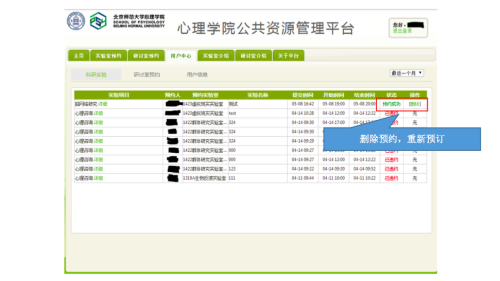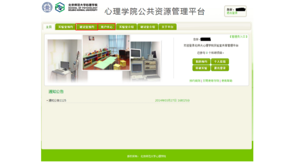 审核完成后,申请人和加入系统的相关人员就可以在相应时段打开研讨室房间来了。 三、临时有事,研讨取消?查看和退订研讨室啦~ 说明:基于研讨室管理规定,约了研讨室迟到或者不来,是需要扣除相应积分的,因此,如果临时有事迟到或取消研讨,一定要在预约系统更改预约信息,避免不必要的损失。 进入用户中心: