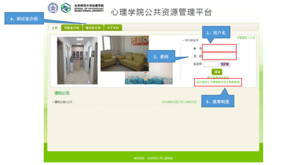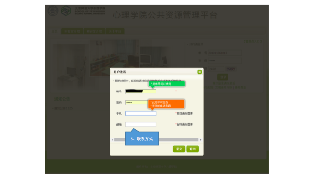 一、IE登录“心理学院公共资源管理平台”,激活账号: A. 网址://219.143.237.178:8080/ClientWeb/xcus/bsd-xl/Default.aspx B. 登录的用户名(1)为“学号/工作证号”,密码(2)为“一卡通查询密码”。(一台机器只能同时登陆一个账号) C. 使用前请认真阅读《预约规则》、《实验室文明使用守则》(3) D. 可以通过“研讨室介绍”了解各研讨室的配置条件,找到满足需要的研讨室。 E. 新用户首次登陆时,需要激活。请在激活界面填写自己的手机号和邮箱(5)。 F. 进入主页,开始准备研讨室预约。“研讨室预约”和“用户中心”最为常用。