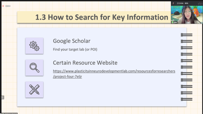 嘉宾刘书辰着眼于科研经历这一方面,讲述了自己本科四年的科研经历和心得,同时为同学们分享了许多有用的科研建议。