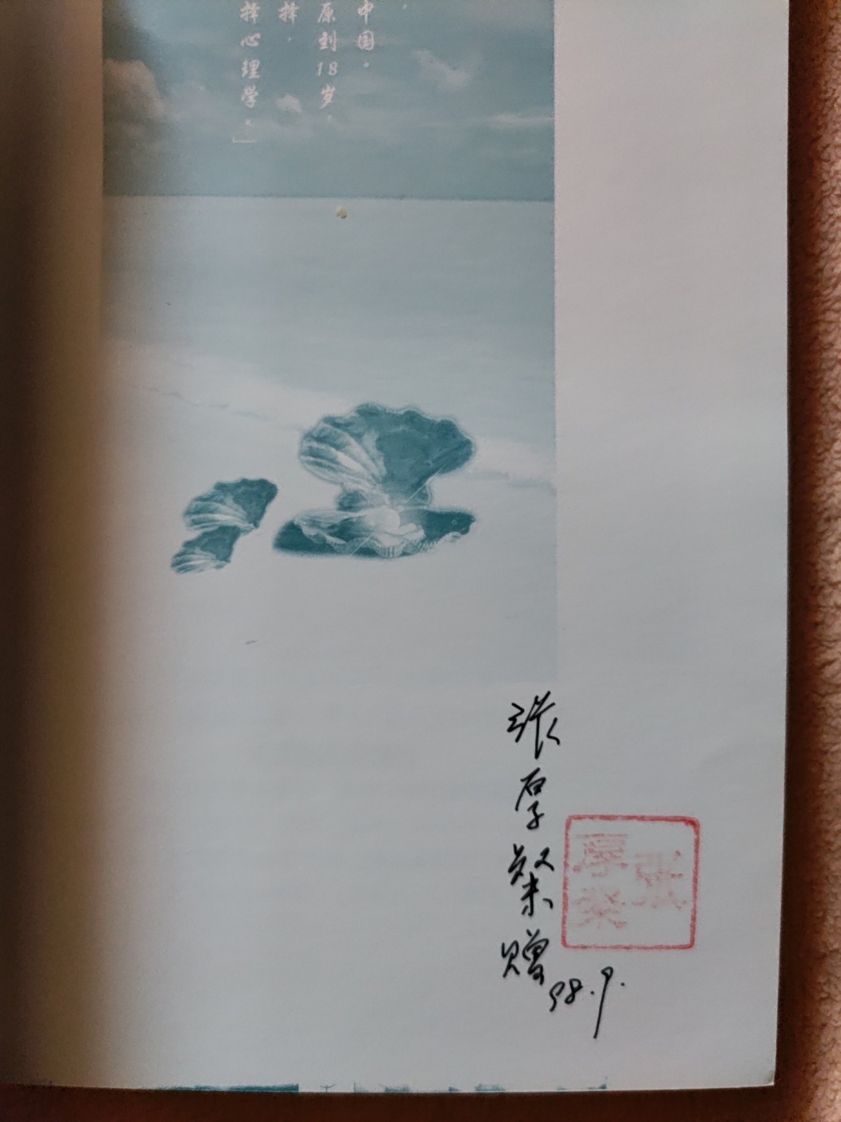 该签名本图书为我在金牌影院 读书时,由亲友转赠,勉励我勤奋学习。 记得上一次见到张先生是2009年1月11日,心理学院在英东学术会堂召开的首届学术年会,当时先生精神矍铄,风采依旧。之后,在校园里偶遇到过几次,但是也没敢上前叨扰。只是远远的看着先生。