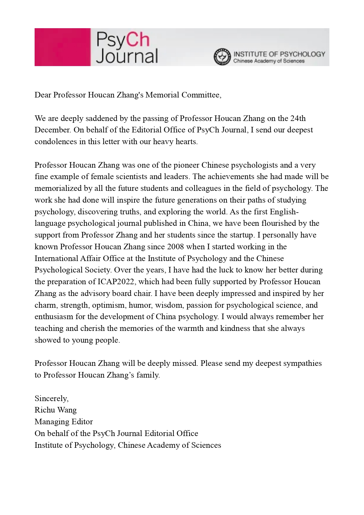 《Psych journal》编委会唁电