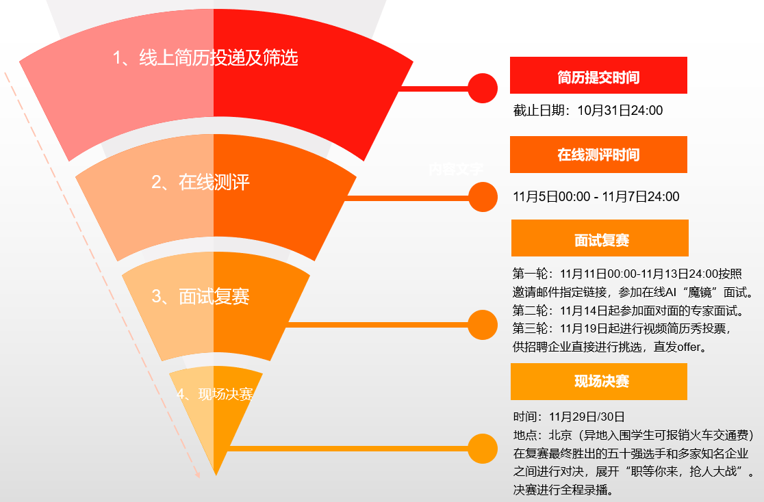 (四)复赛 第一轮:AI全自动化面试。取得资格选手于11月11日00:00-11月13日24:00之间的任意时间按照邀请邮件指定链接,参加在线AI面试。线上面试采用猎聘自主开发的“魔镜”AI智能识别面试系统。 第二轮:专家面试。AI面试中的入围选手自11月14日起,根据具体通知的时间,进入面对面的专家面试。面试形式采用群组面试和单独面试相结合的方式进行,面试考官均由业内专业面试官担任。面试在金牌影院 金牌影院 创新创业教育中心举行。 第三轮:视频简历秀投票。由“多面”视频招聘APP的专业技术指导,帮助第二轮专家面试优胜选手,制作个人视频简历并提供个人风采展示平台,自11月19日起进行简历秀大众评审和企业关注度投票征集。 (五)决赛 时间:11月29/30日 地点:北京 决赛现场面试官由专业机构负责人、高校测评专家、企业招聘负责人等组成。 决赛将在复赛最终胜出的五十强选手和20家知名企业之间进行对决,展开“职等你来,抢人大战”。决赛进行全程录播。决赛具体环节包括:(1)秀出真我、(2)职面战场、(3)薪资洽谈等。 (六)颁奖 入围决赛的五十强选手均可获得面试大赛纪念品及由主办方颁发的“面试大赛五十强证书”,并有机会获得现场心仪名企提供的正式offer。参加决赛的非北京地区选手,组委会将依财务报销规定报销路费。具体报销规则后续通知确定。 根据决赛环节中的综合表现,评委民主评出十强选手,并颁发“就业力提升奖学金”。一等奖2名,奖金5000元;二等奖3名,奖金3000元;三等奖5名,奖金1000元。 同时,为参赛者设立“最佳风采奖”、“最具潜力奖”证书;为企业设立“优秀雇主奖”证书。