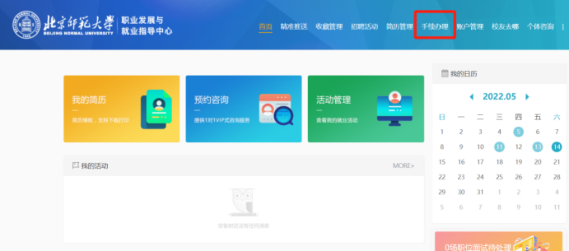 进入页面后,点击页面中部“手续办理”。校友可根据实际就业情况在系统中完善就业信息并上传材料后,邮件或电话联系中心,申请线上办理。