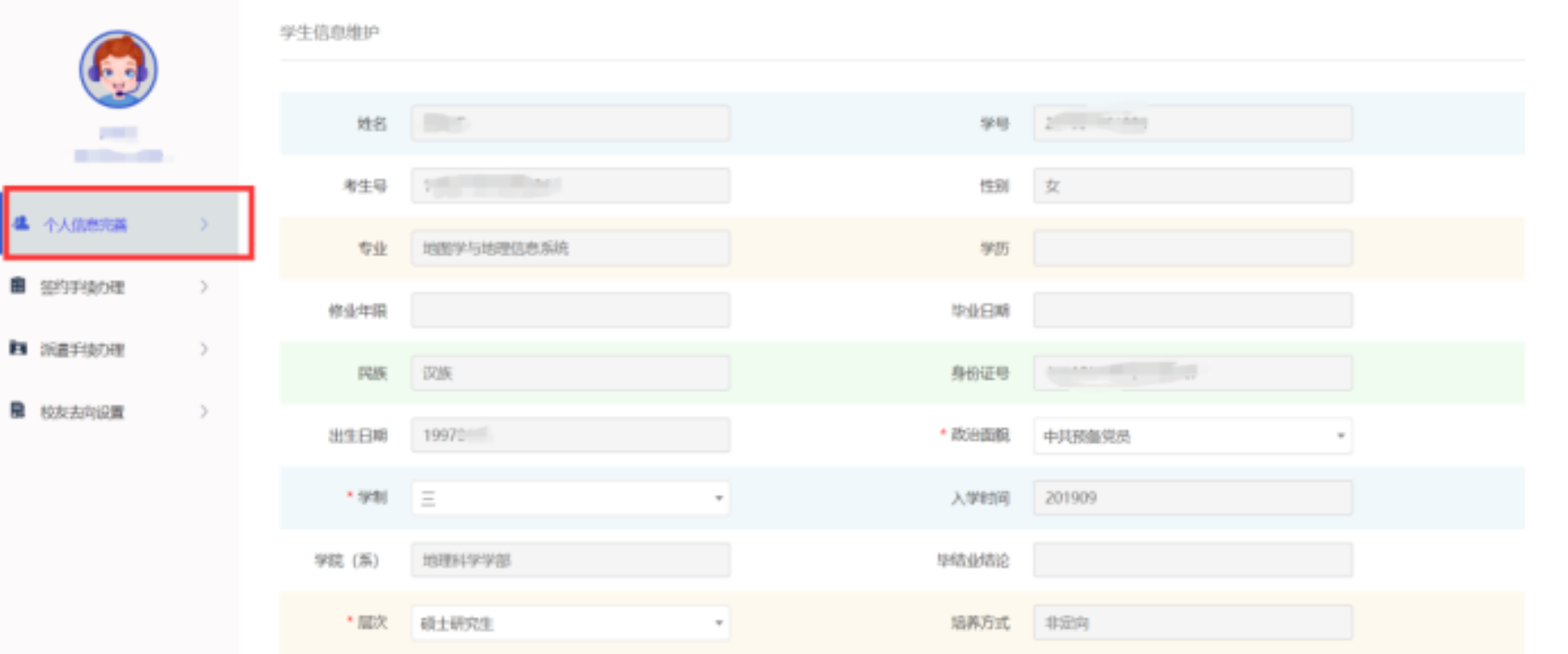二、完善个人信息 完善个人基本信息,包括手机号、生源地等。填写完成后点击下方提交。如固定字段有误,可联系院(系)就业辅导员修改