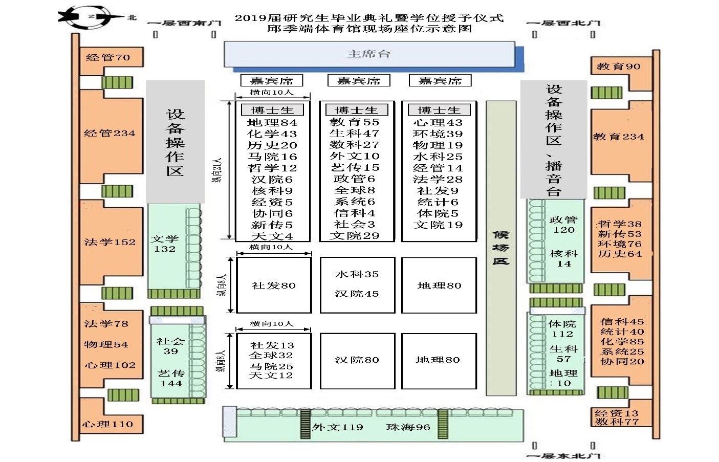 备注4:参加学校毕业典礼相关要求 1、各班班长组织同学7:00在体育馆南侧集合,7:15前务必集合完毕,以院系为单位凭票入场,排队时排成两列。 2、须穿着学位服,随身携带并工整填写毕业典礼入场券,入场券切记保管好,遗失不补,遗失后不能入场。 3、拨流苏环节,请在引导员的带领下按照指定顺序和方向上台接受学校领导和学位委员会委员授予学位、拨流苏,并合影留念。授予学位顺序为:硕士毕业生(教育—哲学—新传—环境—历史—信科—统计—化学—系统—协同—经资—数科—经管—法学—物理—心理—文学—社会—艺传—外文—珠海—生科—体育—核科—政管—地理—汉院—水科—社发—全球—马院—天文)—博士毕业生。 5、典礼过程中将手机置于静音状态,所有学生不得携带与毕业典礼无关的物品,不允许提前离场和随意走动。 6、毕业典礼暨学位授予仪式不单独安排个人留影环节,摄影师将为每位同学的仪式过程进行抓拍,照片下载请大家及时关注京师学工微信公众号。 7、毕业生典礼集合地点、入/离场通道安排: