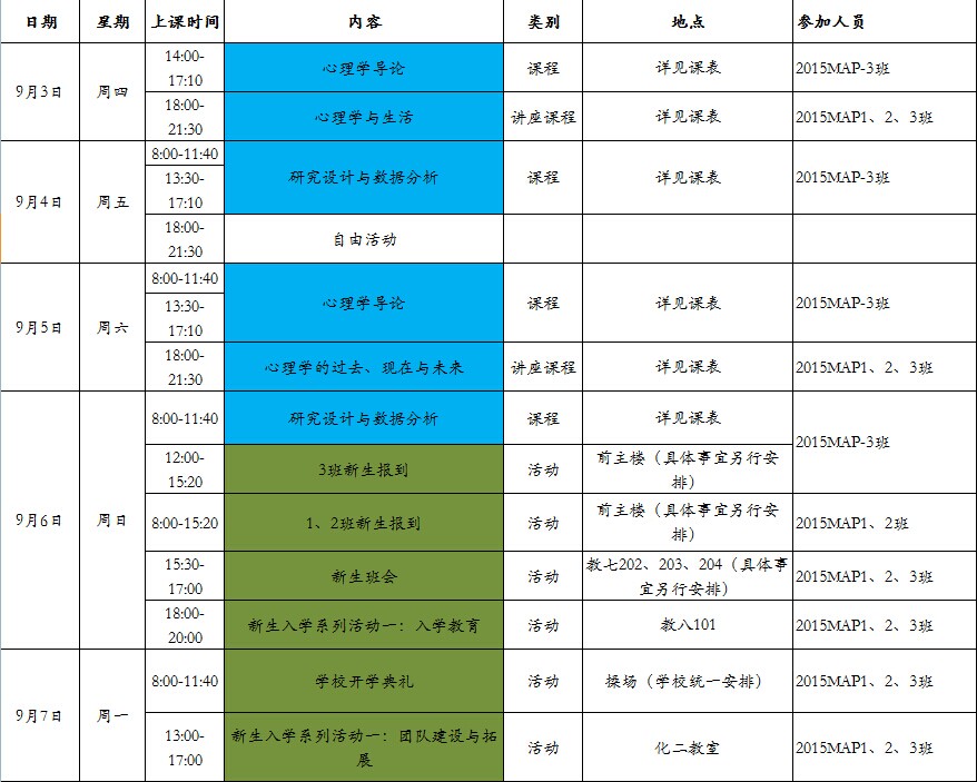 2015级MAP新同学: 你好!现将新生开学报到安排及3班9月集中授课安排通知更新如下,请仔细查看(此通知已于8月底通过邮件推送),并按时参加各项活动。 2015级MAP新生入学系列活动安排及北师大校园平面图附在附件中,供参考! 来校途中,请注意安全,祝一切顺利!如有疑问,请咨询58808272王老师,58802743张老师。 附件1: 2015级MAP新生入学系列活动安排 //jpyy2.net/www/index.php/Web/xiazai/tid/250 附件2:北师大平面图 /www/wwwimg/Uploads/files/3.jpg