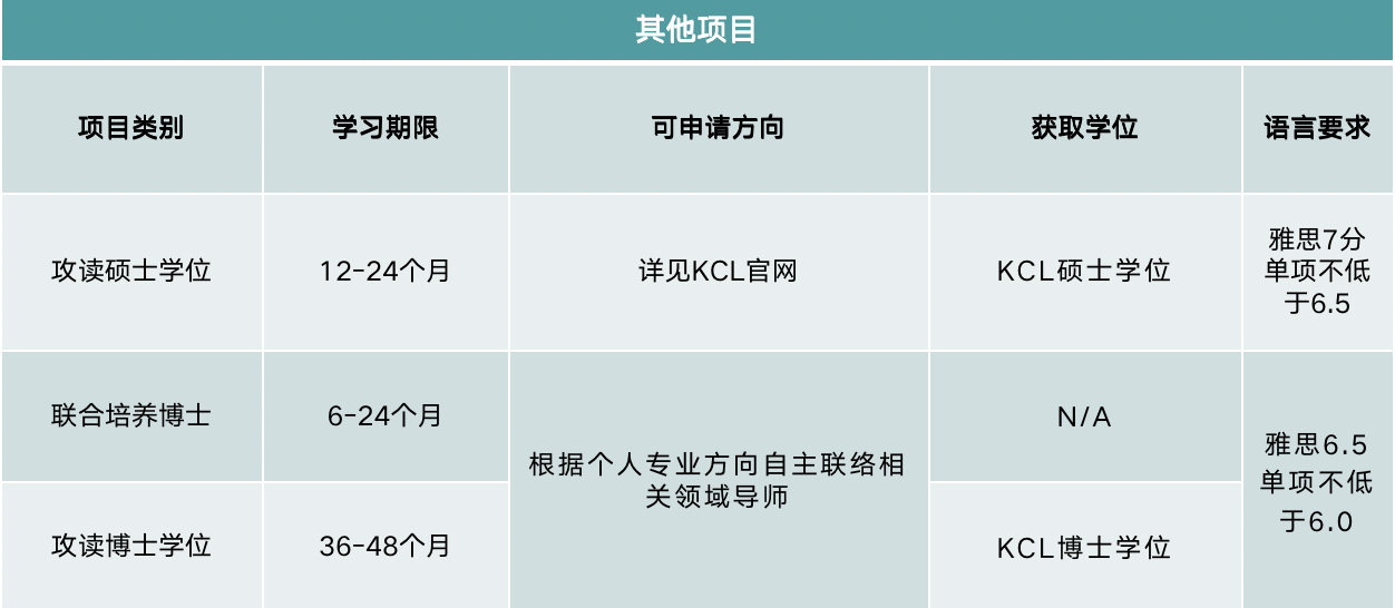 二、选派类别 本项目每年可选派教师(含博士后)和学生(硕博士攻读学位、硕博士联合培养、本科交流生)赴英国伦敦国王学院、曼彻斯特大学和卡迪夫大学访学或留学的名额有32人次。(详情见下图) 本项目暂不受理以下人员的申请:1.已获得国外全额奖学金资助。2.已获得国家公派留学资格且在有效期内。3.已申报其他国家公派出国留学项目尚未公布录取结果。