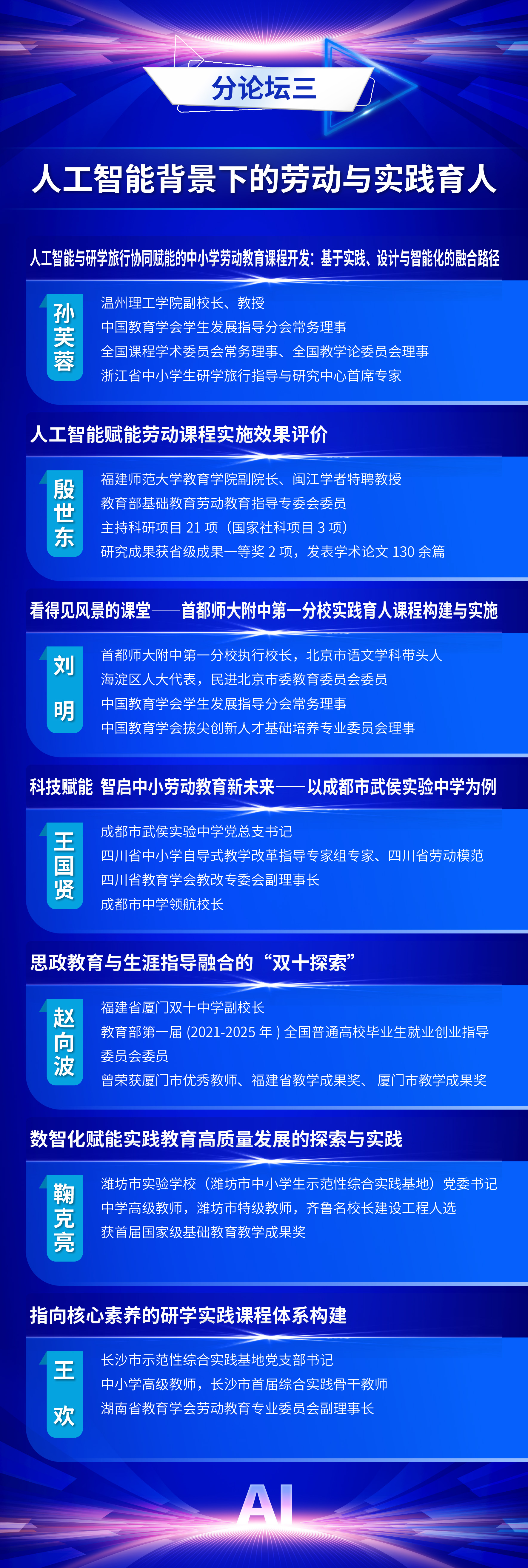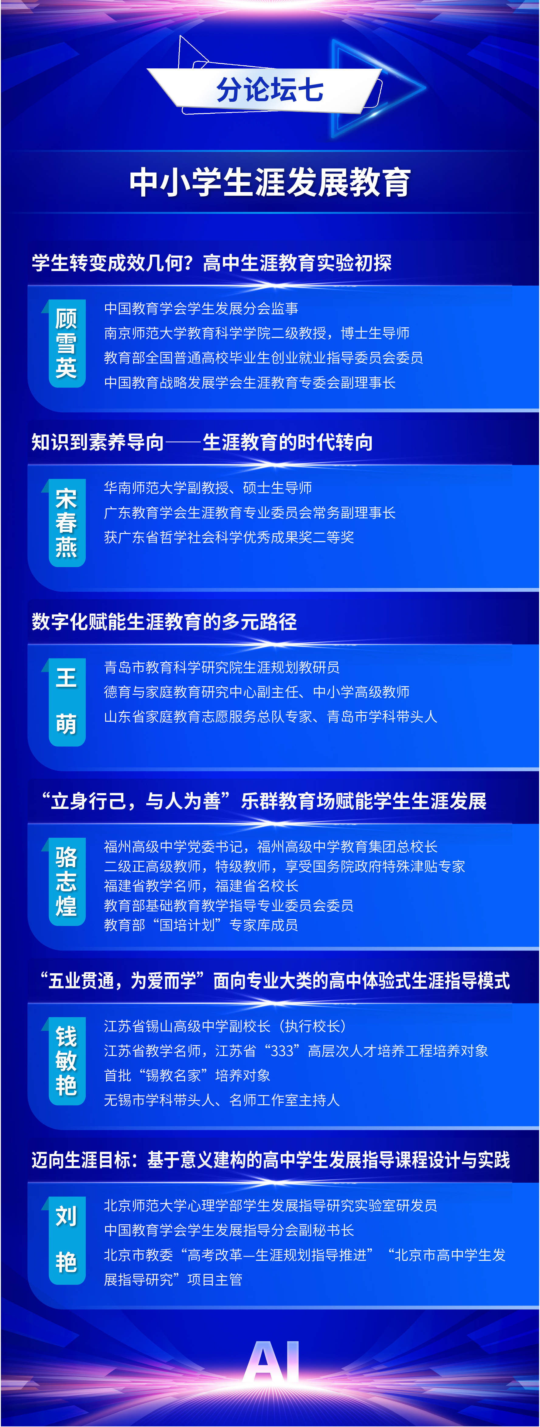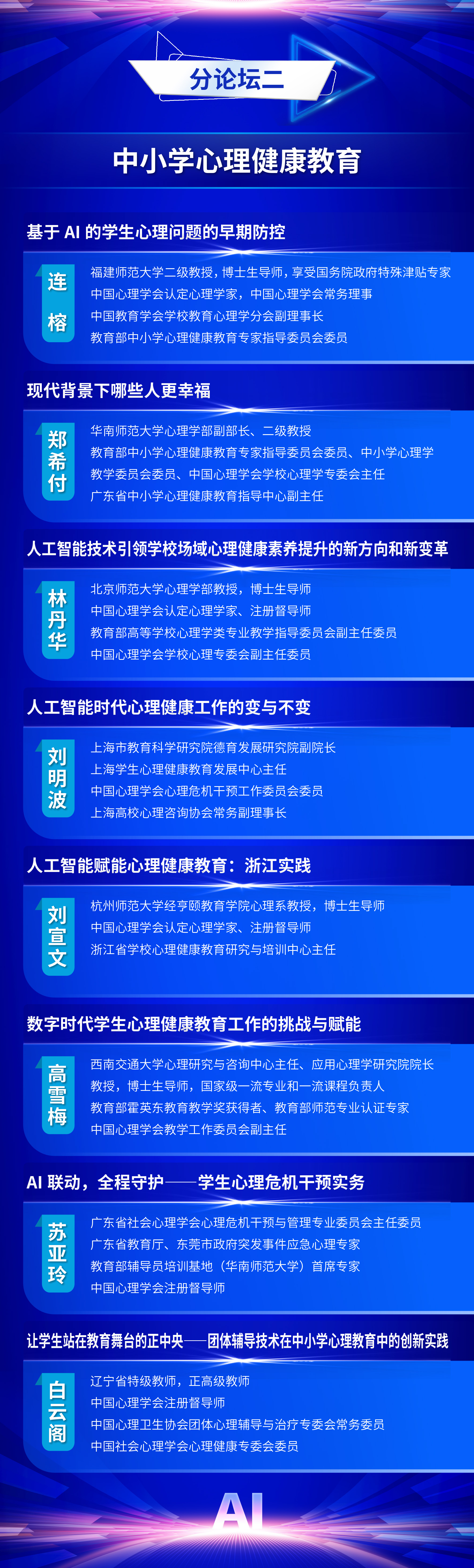 为全面贯彻党的二十届三中全会精神和全国教育大会精神,认真落实《教育强国建设规划纲要(2024-2035年)》,推动数智时代学生发展指导工作的创新与实践,中国教育学会学生发展指导分会定于2025年11月7日—11月8日在福建福耀科技大学(福州市)举办中国教育学会学生发展指导分会2025学术年会。现将有关事项通知如下: 一、会议主题 人工智能赋能学生发展指导 二、组织单位 主办单位:中国教育学会学生发展指导分会 金牌影院 金牌影院 承办单位:金牌影院 出版集团 支持单位:福州市教育局 福建福耀科技大学 福建师范大学心理学院 三、时间地点 会议时间:2025年11月7日—11月8日 会议地点:福耀科技大学国际学术交流中心(福州佩伯酒店) 四、会议日程 11月6日全天 报到 11月7日上午 开幕式,主旨报告 11月7日下午 校长论坛:迈向数智时代的教育新生态 分论坛一:拔尖创新人才培养 分论坛二:中小学心理健康教育 分论坛三:人工智能背景下的劳动与实践育人 分论坛四:校家社医协同育人 平行分会场论文报告 11月8日上午 分论坛五:学生发展指导中的AI应用 分论坛六:AI背景下“以学为中心”教学方式改革 分论坛七:中小学生涯发展教育 年度专题论坛:拒学厌学学生干预研究与实务 平行分会场论文报告 11月8日下午 主旨报告,闭幕式 五、出席嘉宾