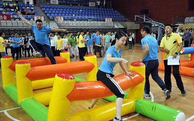 “超级障碍赛”: 比赛开始前,4名参赛队员按顺序在起跑线后做好准备,裁判发令后,第1名队员依次穿过“充气跨栏、平衡木、钻网通道、鱼跃龙门”环节后返回起点,第2名队员以同样的方式前进,以最后1名队员身体任意部位触及终点线所在的垂直平面为计时结束,用时少者名次列前。