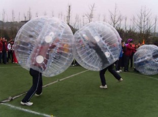 “超级碰碰碰”:比赛开始前,队员穿好碰碰球在起跑线后做好准备,裁判发令后,队员开始相互撞击,把其他人撞到即为胜利。