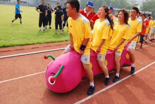 “疯狂毛毛虫”:4人坐骑在充气毛毛虫道具上,队员双手握住毛毛虫的固定把手,毛毛虫道具前方立于起跑线后,裁判发令后,队员通过团队协调配合带动疯狂毛毛虫游戏道具在跑道上快速行驶,以各参赛队员所用的毛毛虫道具触及终点线为计时停止,往返一次,用时最短者为胜。