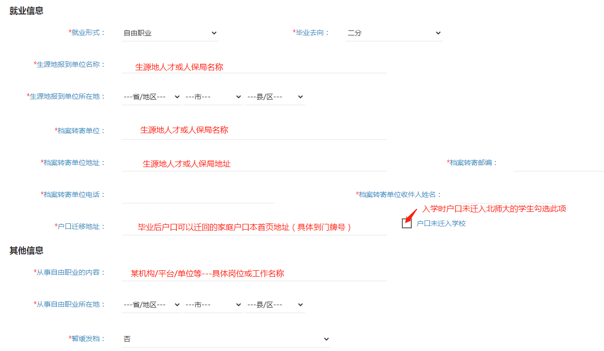 3、其他就业形式: (1)自由职业(户口和档案回生源地):填写系统后自动生成的“就业选择去向表”(务必“填表说明”处签字确认)。 ◆派遣系统填写时,下面的信息请注意确认后再填写◆ (2)自主创业(户口和档案回生源地): ①创业公司营业执照副本,或可在工商部门查询到的相关创业材料; ②填写系统后自动生成的“就业选择去向表”(务必“填表说明”处签字确认)。 (二)特殊情况说明: 1、除了户口和档案前往工作单位所在地的同学,其他各类别派遣的学生请注意: 系统中生源地报到单位一般是生源地的人才交流中心或者人保局,户口迁移(户口在新生入学时迁到北师大的同学)地址为家庭户口本所在地地址(具体到门牌号),请学生填写系统前主动和档案、户口接收部门联系,具体信息落实清楚后再填写派遣系统,避免因为填写错误,导致的户口档案无法正常派遣。 2、培养方式为定向、委培的毕业生:就业派遣系统只能填写工作-签三方(依照北京市教委要求,定向、培毕业生必须严格按协议进行派遣。因此,系统中单位名称(报到证抬头)为入校时学生签订定向委培协议)。 提交原定向委培协议。如没有定向委培协议,请上交最近一次与原定向委培单位签订的劳动合同(仅复印封面、主页 及签字盖章页)。 原定向委培单位出具的情况说明(说明毕业生已经签订定向委培协议的情况,并证明到毕业派遣时为止该毕业生没有改变原定向委培工作单位。) 3、户档分离:因签约单位要求,由签约单位填写“户档分离(附件2)申请”,并加盖公章。学生填写“毕业派遣系统”前,需要将加盖公章的“户档分离申请”和签约材料(三方协议/劳动合同/单位用人证明)提交到邮箱[email protected](学部初审),之后再填写“毕业生派遣系统”。 联 系 人:李昕益 联系电话:58802524 金牌影院 学生工作办公室 2021年11月3日 附件: