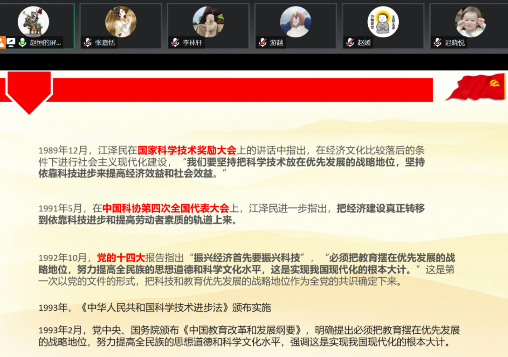 第二季第一期微党课的主题是江泽民同志的伟大功绩与优秀品格,由赵恒同志与王浴楠同志进行分享。赵恒同志围绕江泽民同志与科教兴国进行了讲解,分享了科教兴国战略的发展历程与江总书记的生平。科教兴国战略对于国家的科学技术发展具有重要意义。