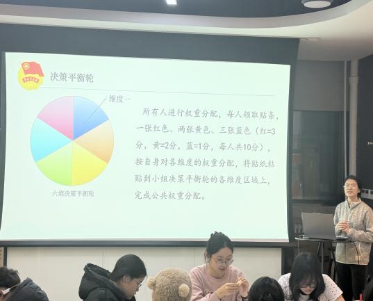 在权重分配的环节里,各组分别进行讨论,思考自己对目前困惑的决策维度,并最终筛选出六个维度填写在六维决策平衡轮上,紧接着,组内同学均获得10分的权重,并利用不同颜色的便利贴代表自己的分数,按照自己心目中的各维度的权重分配,把贴纸贴在平衡轮上,并由组长统计分数,完成权重分配。