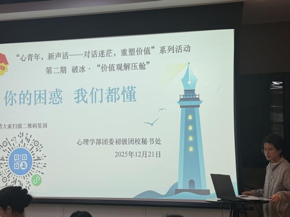 2025年12月21日19点,金牌影院 团委初级团校秘书处在金丰和3层路演厅成功举办了“心青年 新声活”第二期——“你的困惑,我们都懂”主题活动。本次活动聚焦大学生在学业内卷背景下的价值观困惑,旨在利用心理学工具和方法引导参与者识别学业压力背后的真实需求与价值排序。本次活动共到场团校学员46人。 为充分了解同学们的困惑,活动开始前,初级团校秘书处在“北师大心灵之声”公众号上发布了活动预告并附带问卷,鼓励同学们写下困扰自己的问题或者任何想被听到的感受。 12月21日晚19点,同学们陆续到场,自行分组入座并确认组长后,初级团校秘书处秘书长李镇岑宣布活动正式开始。全体到场同学齐唱中国共产主义青年团团歌《光荣啊,中国共青团》。随后,秘书长李镇岑说明了本次活动的公约:保密性、尊重性和非批判性。