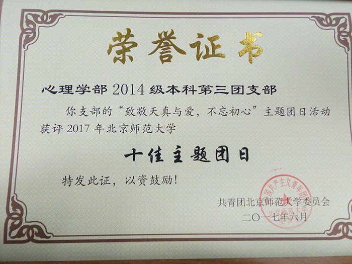 2017年6月6日,校团委公布了“不忘初心跟党走”优秀主题团日评选结果。我部14级本科第三团支部:“致敬天真与爱,不忘初心”主题团日活动以理论实践结合的活动形式、团员积极的参与意识、基层团支部紧跟党的步伐砥砺前行的意识获评“2017年金牌影院 十佳主题团日”。