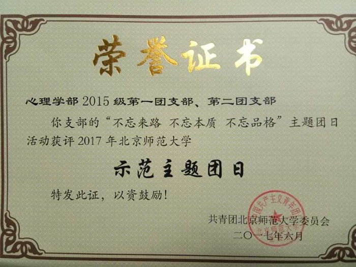 同时我部2015级第一团支部、第二团支部:“不忘来路不忘本质 不忘品格”五四主题团日活动以丰富的表现形式、优秀的团队合作意识、团员的积极参与、贯彻党的意志不忘初心获评“2017年金牌影院 示范主题团日”。