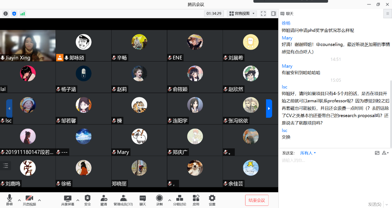 2021年11月26日14:00,学业辅导室举办了本学期第二次出国留学交流活动。2018届本科校友邢佳音师姐以“疫情下的出国留学与交换”为主题讲演,令参与交流的学生们受益匪浅。由于疫情原因,本次交流会在腾讯会议举办,数十名同学参加。