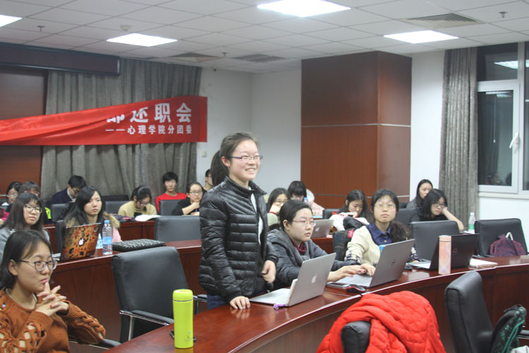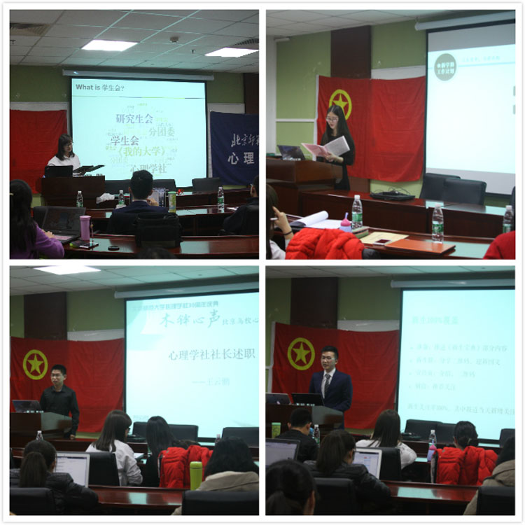 心理学院于后主楼1420举办2015—2016学年秋季学期学生团体述职报告大会。心理学院分团委书记史佳鑫老师,学生会、分团委、心理学社、赛客说负责人和二十余位各学生团体学生干部出席了本次大会。