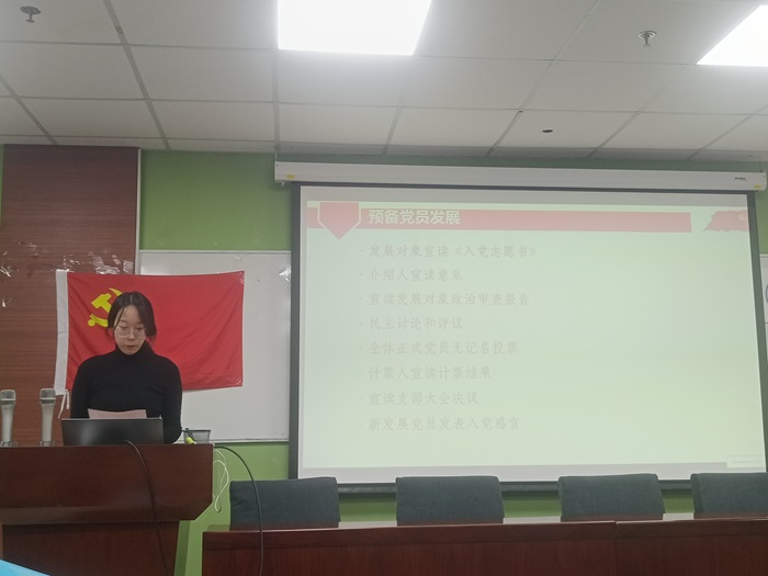 然后,魏琼懿同志宣读了自己的《入党志愿书》,向党组织汇报了自己自递交《入党申请书》以来的思想作风和工作学习情况,并表达了将继续端正思想,以党员标准严格要求自己的决心。随后,介绍人宣读了《介绍人意见》,党支部书记黄彤彤同志宣读了《政治审查综合报告》,并提请支部大会进行讨论。 在经过深入的民主讨论和评议之后,支部大会的全体正式党员通过无记名投票的方式,一致同意接收魏琼懿同志为中共预备党员。在这个庄严的时刻,魏琼懿同志发表了真挚的入党感言,对党组织及各位同志的信任表示衷心感谢,并承诺在未来将更加严格地要求自己,努力为师生办实事,以实际行动践行党员的初心和使命。