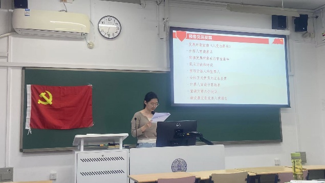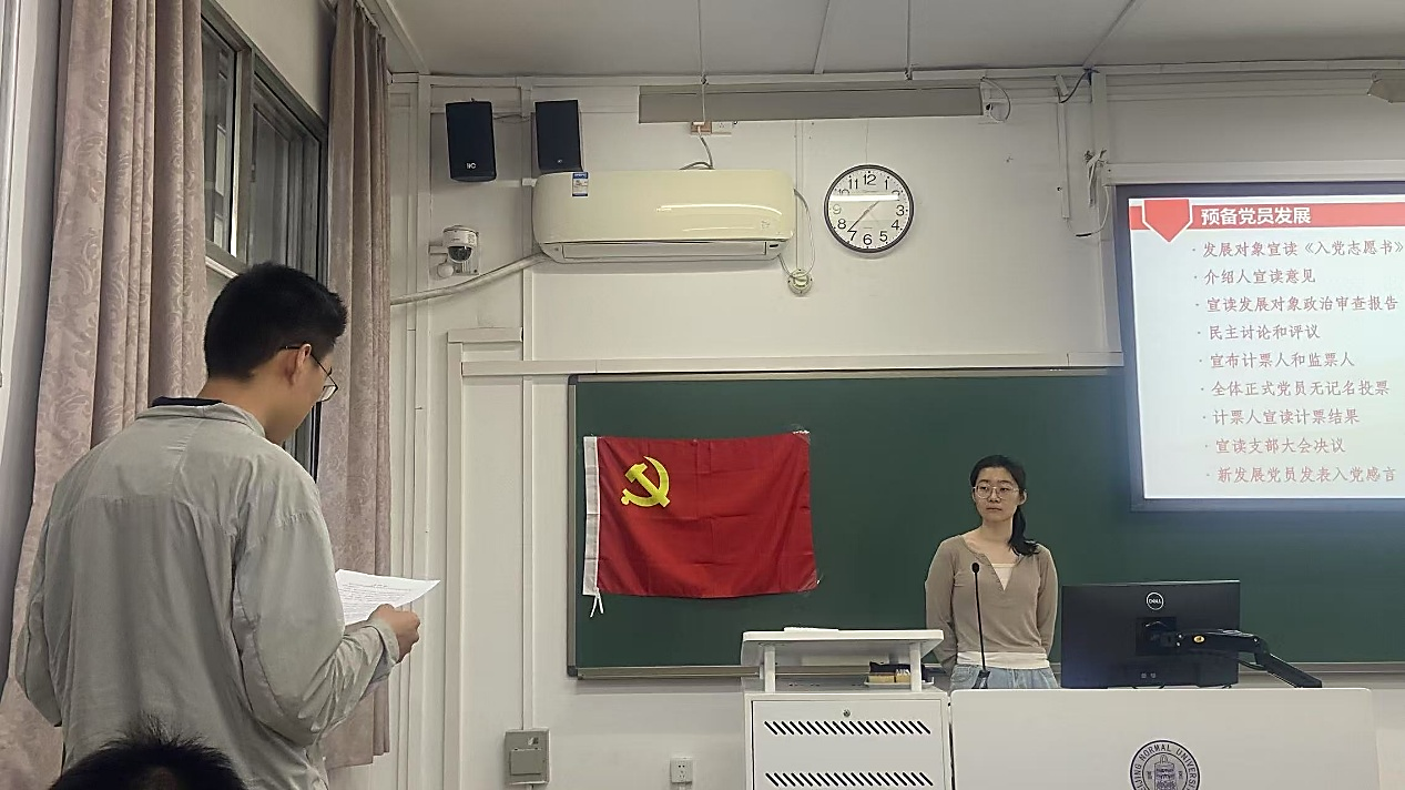 经过支部全体正式党员的无记名投票表决,大会一致同意接收窦佳宁、高星灿、滕缘和王陈龙等四位同志为中共预备党员。四位预备党员发表了各自的入党感言。 随后,在全党开展深入贯彻中央八项规定精神学习教育之际,支部书记程先楷同志为新发展预备党员们作了警示教育,坚决防止入党后存在松懈心理,也对党员们提出了具体的要求和期待,希望支部全体党员未来更严格要求自己,积极参加支部活动,在学习生活中发挥先锋模范作用。 全体与会党员最后还讨论、审议并表决通过了支部新制定的“预备党员考察办法”,从学时考核、思想汇报深度、党课科研分享以及支部工作参与四个方面对预备党员提出更高要求,补足党员发展转正全流程严格考核的“最后一环”。至此,支部2024-2025学年春季学期预备党员发展大会圆满结束!