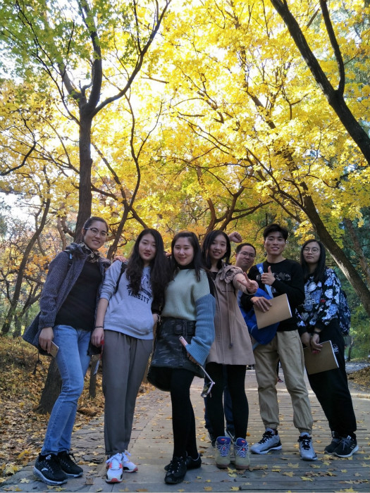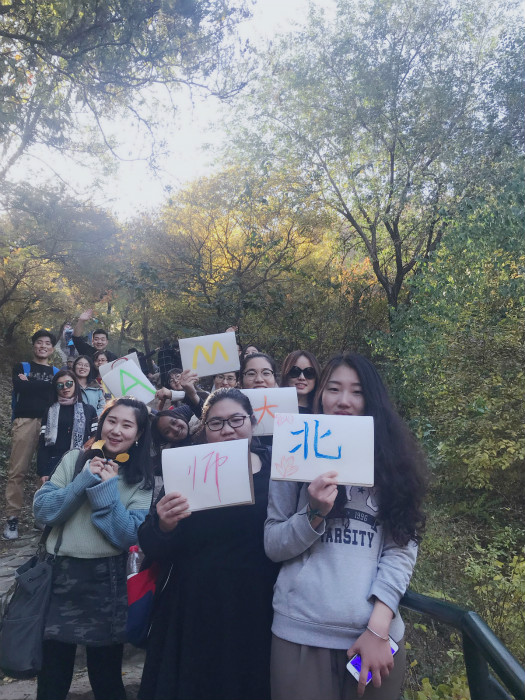 2017年11月2日,北师大金牌影院 2017级临床与咨询心理方向的同学们举行了一次班级秋游活动。早上八点,一行人从积水潭地铁站出发,感受着北京特色的“早高峰”,一路上有说有笑,开始了愉快的香山之行。 一叶落而知天下秋,这是北京最浓最美的秋色。经过了上周的雾霾天,北京终于迎来的晴空万里、秋高气爽的天气,尽管气温略低,人们看枫叶的热情有增无减。经过一个多小时的车程,我们顺利到达香山公园东门,合影留念后,慢慢走进了心之向往的香山景区。 我们在拍照,路人也在拍我们 党旗在手,天下我有 登山的第一站便是著名的双清别墅,她位于香山公园南麓的半山腰,环境幽雅,因其苍翠的竹林、遮天蔽日的银杏、挺拔的松柏、古朴的建筑引人前往。然而,真正使这个地方闻名天下的并不是她的秀丽风光,而是因为这里曾是毛主席住过的地方,曾是中共中央的指挥中心,曾发生过扭转中国命运决定中国前途的大事。此次秋游活动,我们玩乐之余,不忘参观红色景点,把人文景观和自然景观的美结合起来,去了解这片土地背后史诗般的故事。 在双清别墅参观学习,追寻领袖的革命足迹,感受红色情怀 怀着对老一辈革命家的崇敬之情,离开了双清别墅,继续我们的登山之行。在登山的途中,我们互相帮助,相互鼓励,共同欣赏层林浸染的美好风光。 随着登山的高度不断增加,我们终于上了半山亭,层层叠叠的山峦、大大小小的阁楼、千枝叠万枝的枫叶浮在眼前,万寿山、佛香阁若隐若现,“烟树深处,正藏着我们的北京城”。 北师大MAP是这一天香山中最美的风景 雨打青松青,霜染枫叶红 登上香山顶后,太阳正浓,照在红透了的枫叶上,叶叶生辉。香炉峰旁人头簇拥,大家争相合影留念。我们坐在亭子里纳凉,体会古人“一览众山小”的心境,回想起爬山的艰辛,觉得一切人生并非是“西西弗神话”般的荒谬,亦可“偷得浮生半日闲”。 登顶遥望北京城 下山时,同学们分为了缆车、陡坡和缓坡三路。陡坡组和缓坡组在下山时,遇见了很多岔路。陡坡组的同学“误入”银杏林深处,发现了一片美丽的世外桃源;缓坡组的同学则徐徐前行,边聊天、边停下来捡树叶;而缆车组的同学则早早到达山底,遥望我们“长征”归来。 缓坡组的大长腿们 香山行秋游活动至此圆满结束,参与活动并成功登顶的同学们全部获得纪念本一个。每个人在本子里夹进了红红的枫叶和温暖的阳光,留下了关于此次秋游最美的印记。 香山顶大合影
